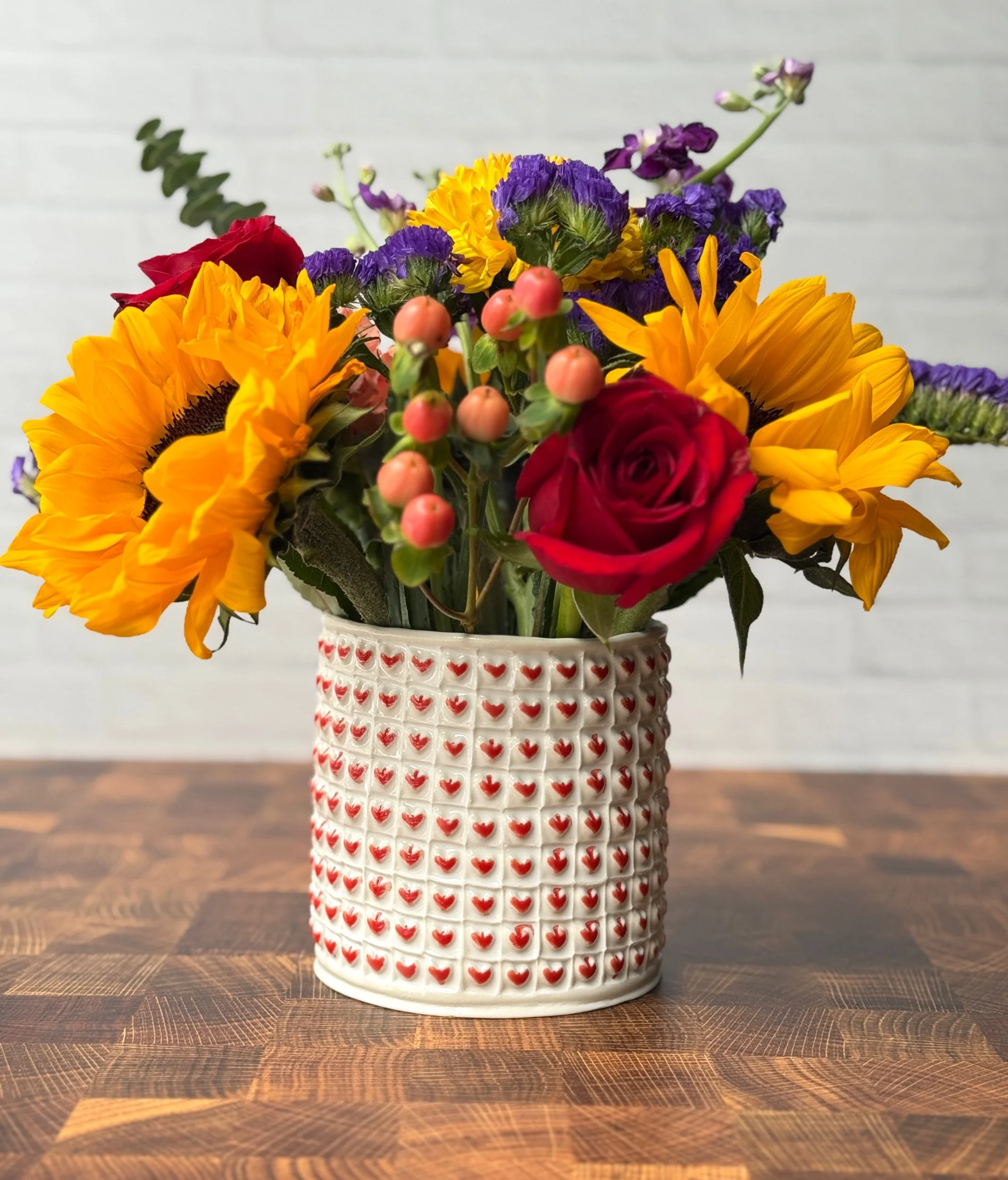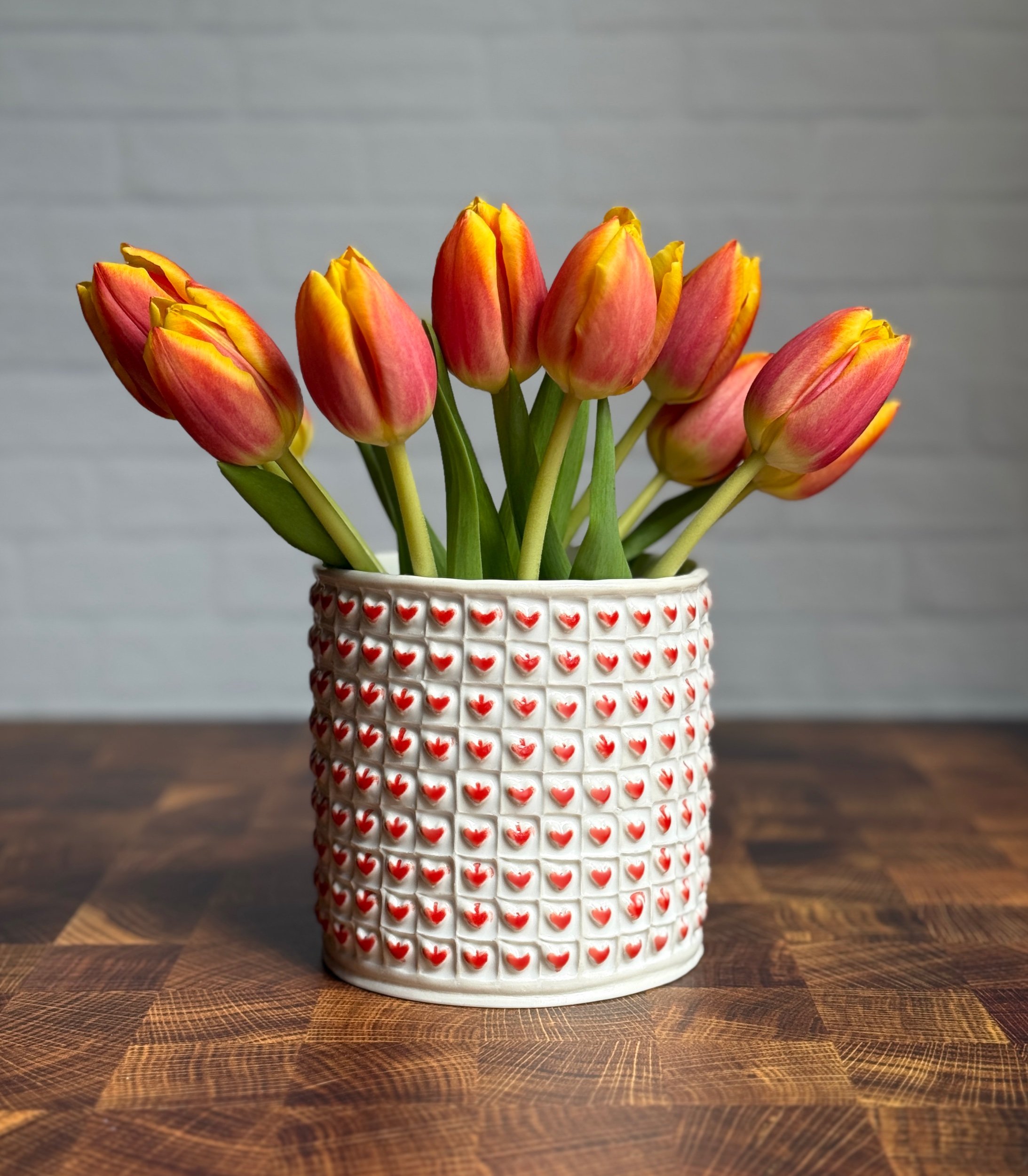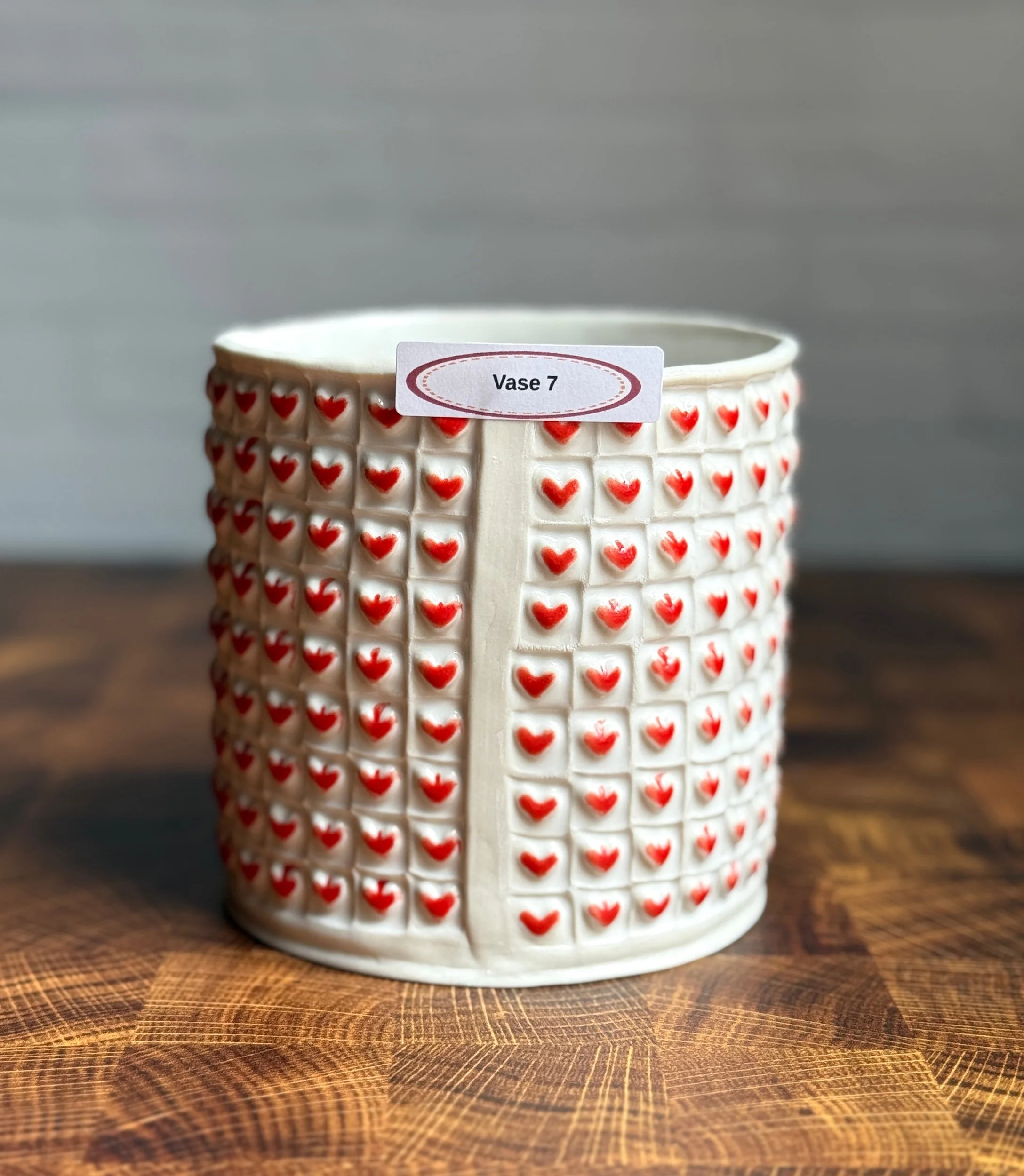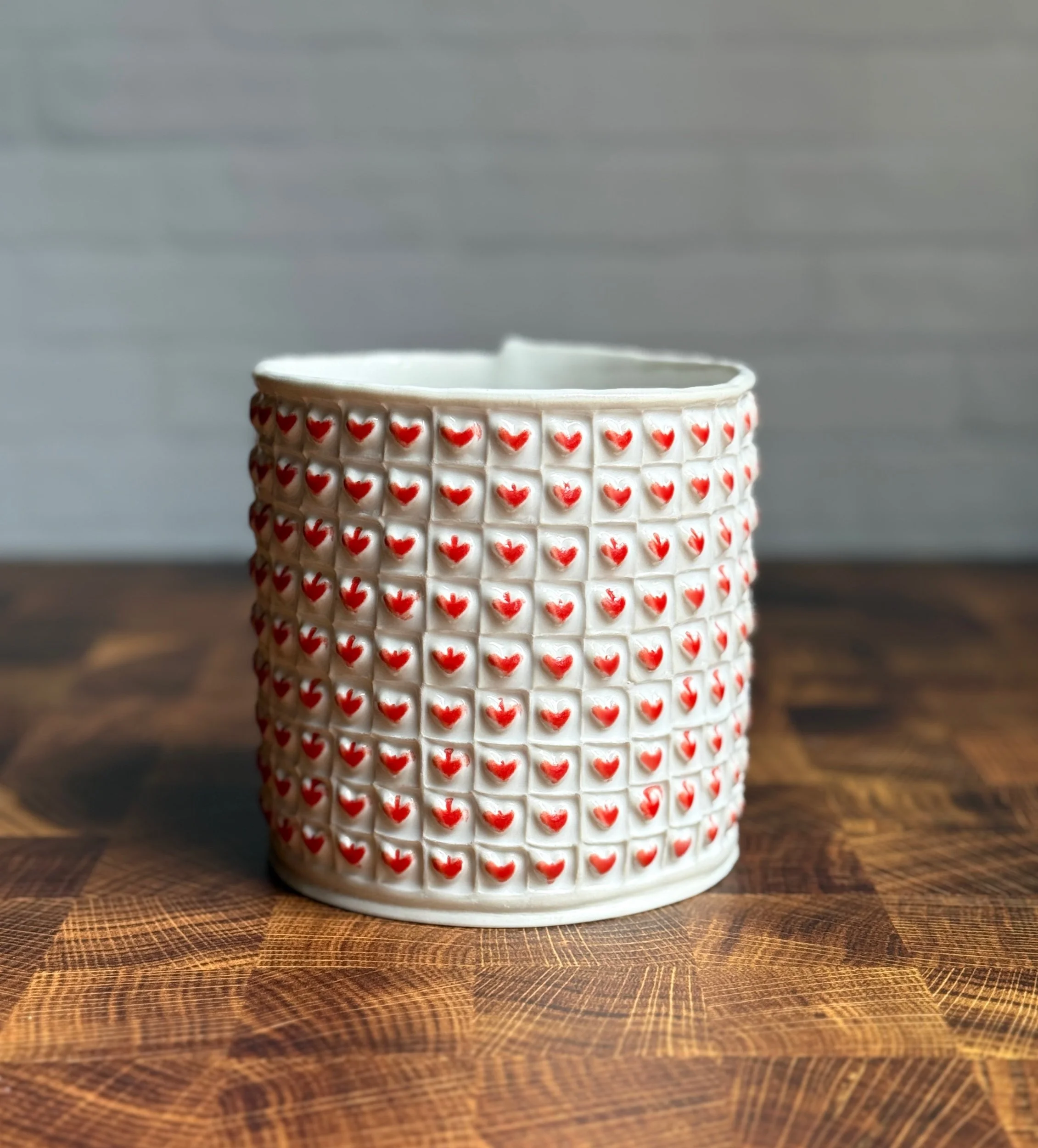 This heart vase is hand built from porcelain. First, the slab is rolled out, then printed with a newsprint transfer to provide the grid for the stamping, then each heart is hand stamped one by one. After the bisque firing, each square is filled with a snowy white celadon glaze, and red is applied to each raised heart before firing for a second time in the glaze firing. Additionally, the bottom of the vase has been sanded smooth to avoid any scratching of surfaces.