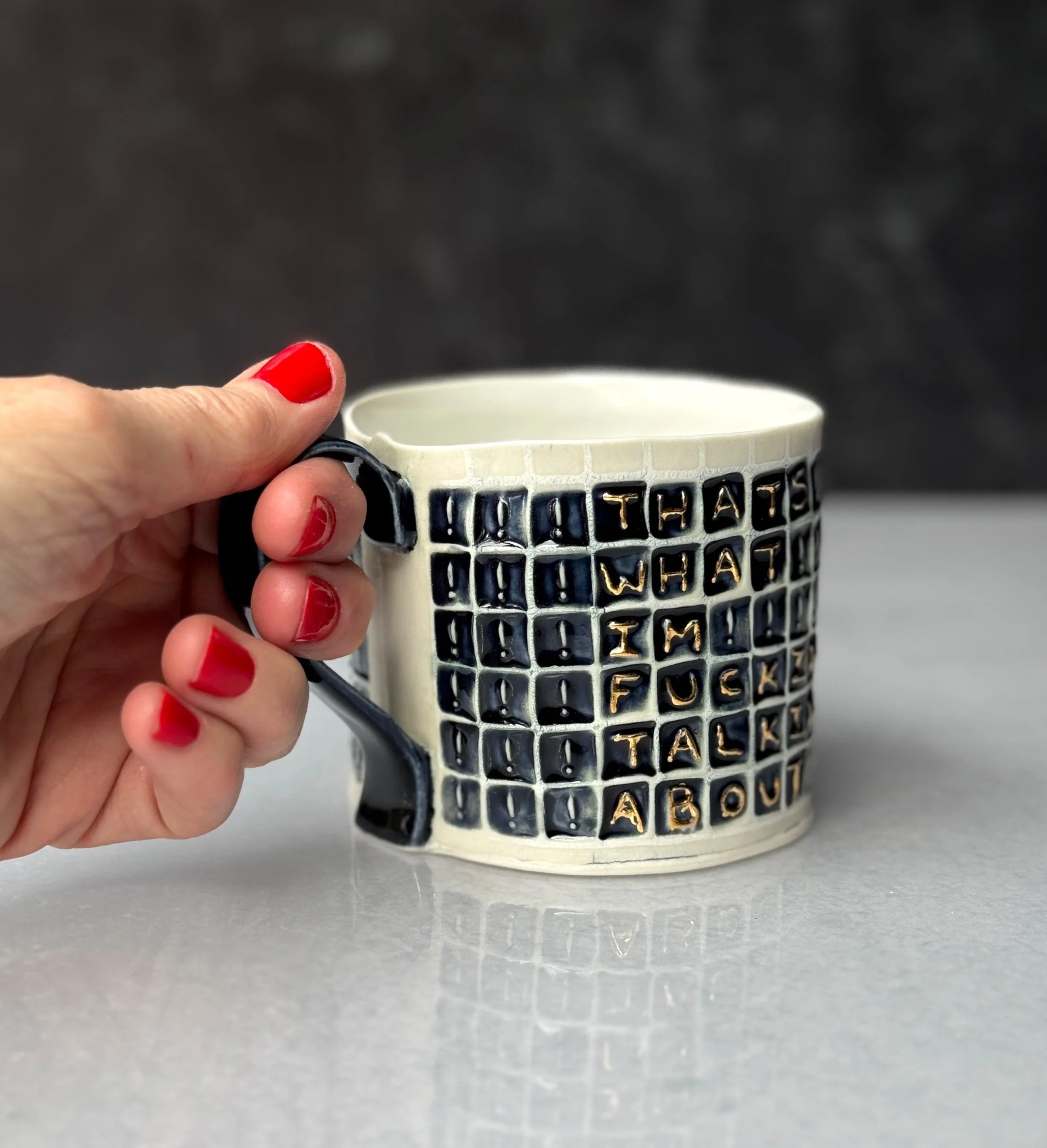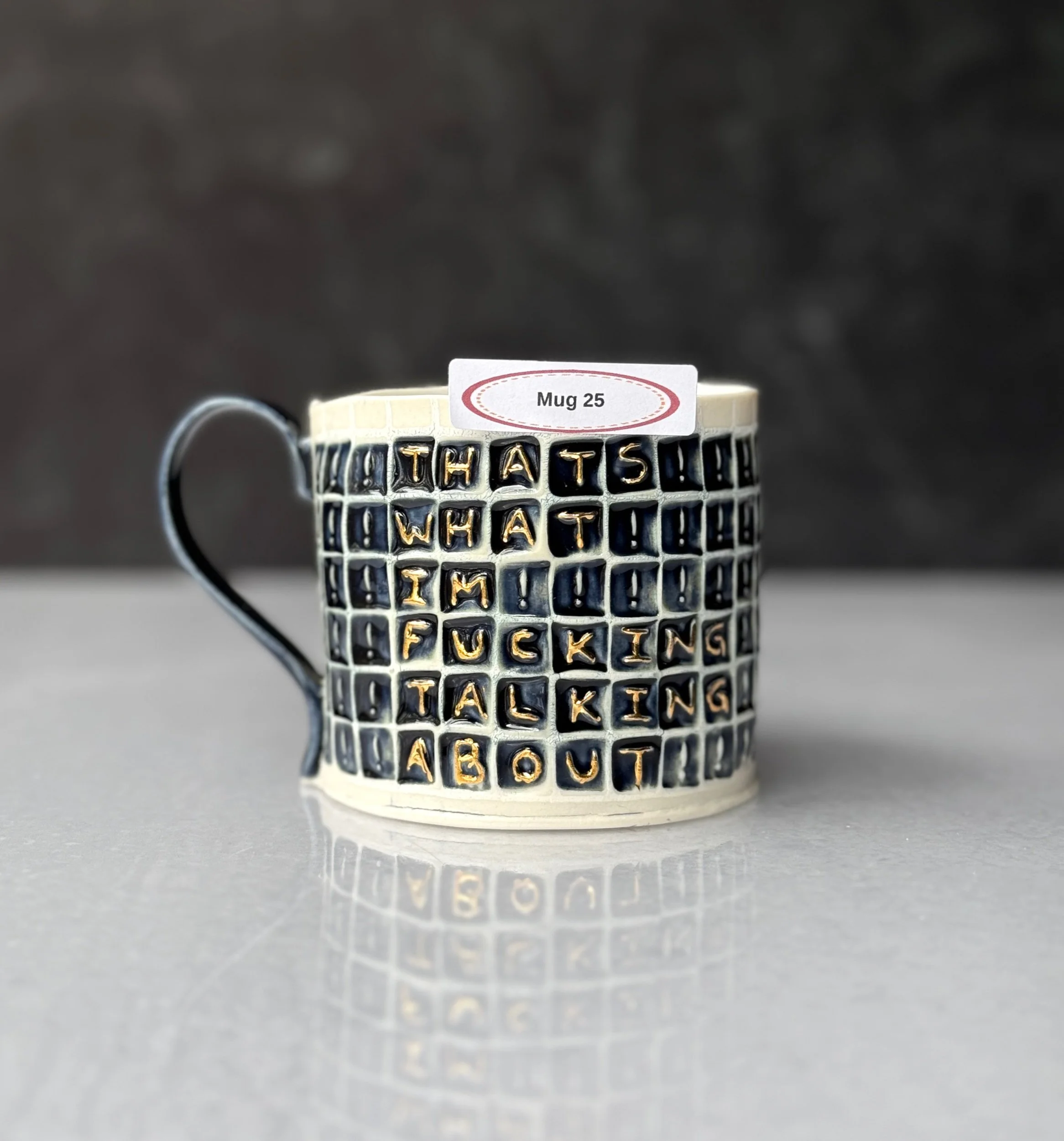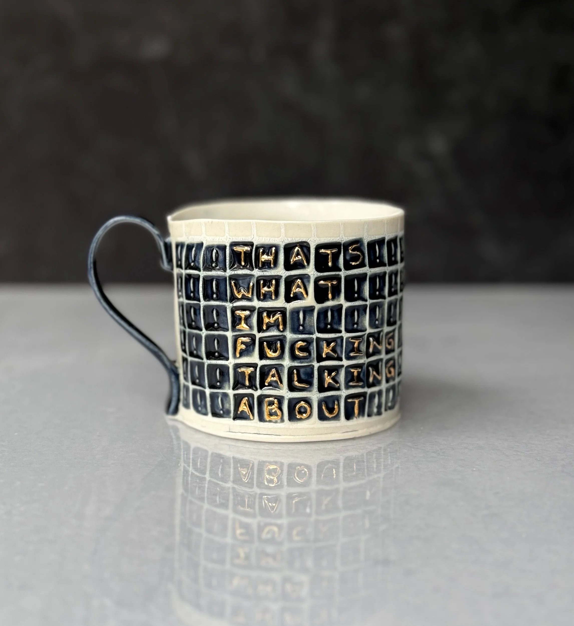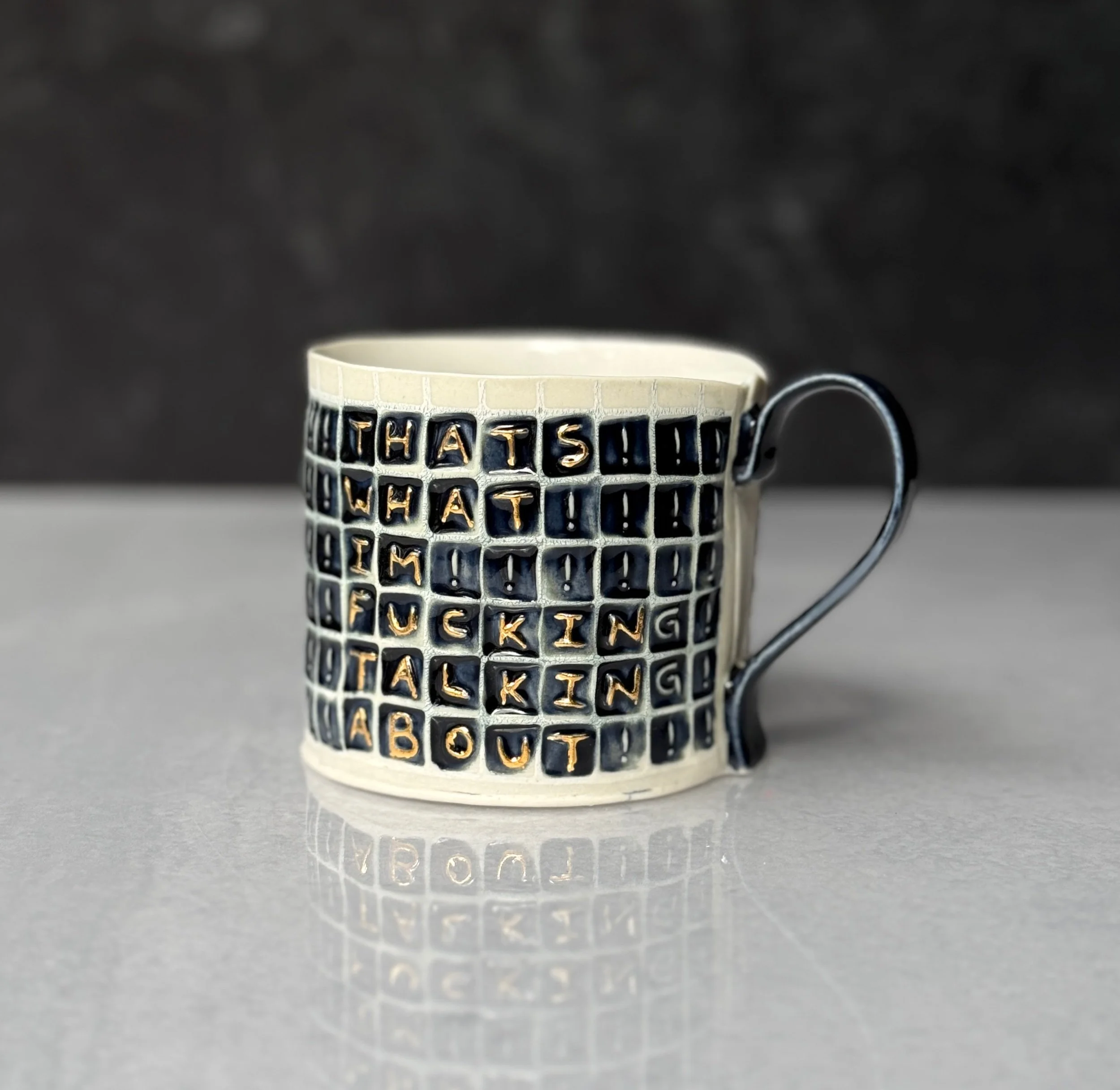 This mug has been hand built from translucent porcelain. The slab is first rolled out, printed with a newsprint transfer, and hand stamped, before being shaped into the mug form. After the first (bisque) firing, each square is filled with a black celadon glaze, and the excess is gently wiped away so the stamped message is revealed. The handle is glazed in a complimentary black celadon glaze. After the glaze firing, each word is hand painted with premium bright gold luster and fired for a third time.