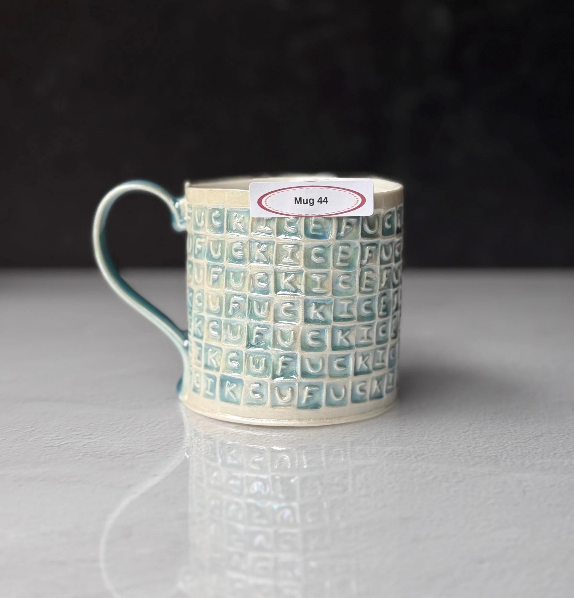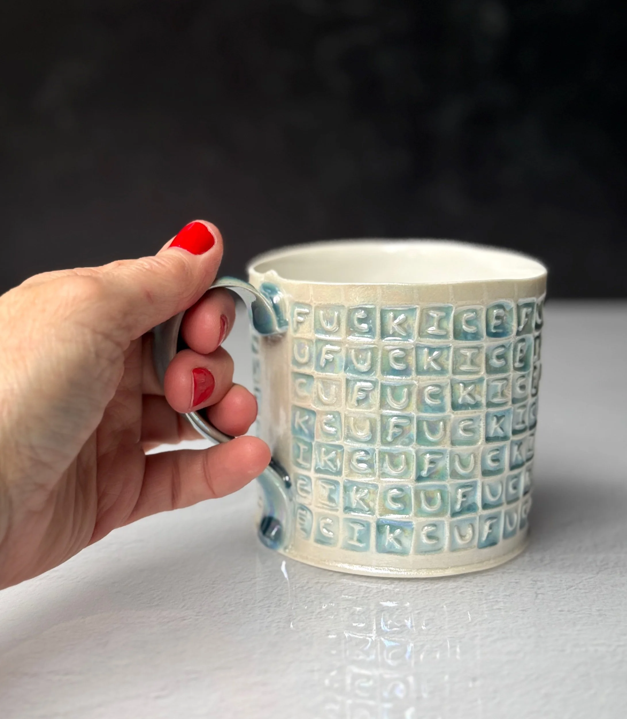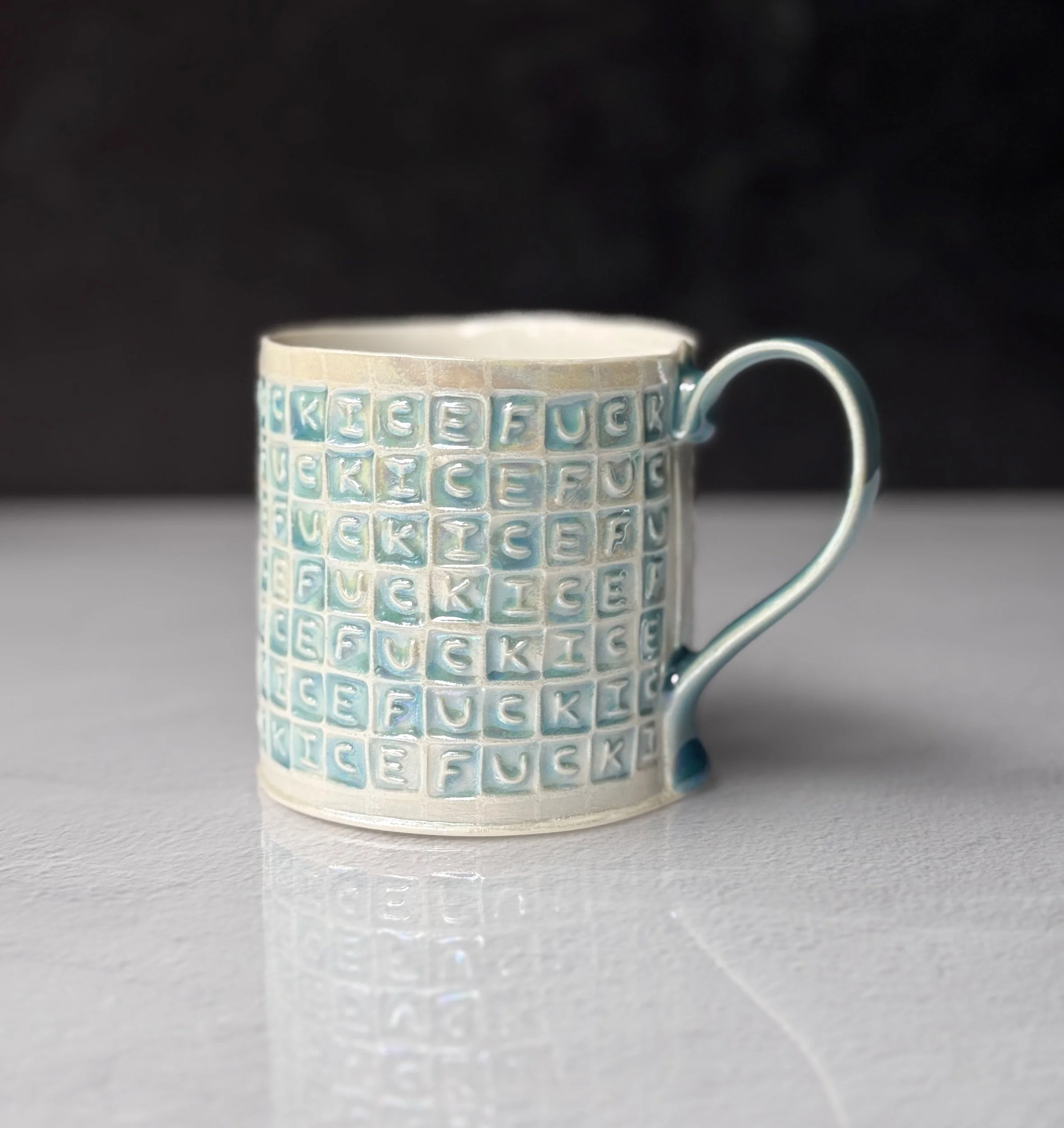 This mug has been hand built from translucent porcelain. The slab is first rolled out, printed with a newsprint transfer, and hand stamped, before being shaped into the mug form. After the first (bisque) firing, each square is filled with an icy blue celadon glaze, and then fired for a second time. To add that extra iridescent quality, the piece is then painted with mother-of-pearl luster, then fired for a third and final time.