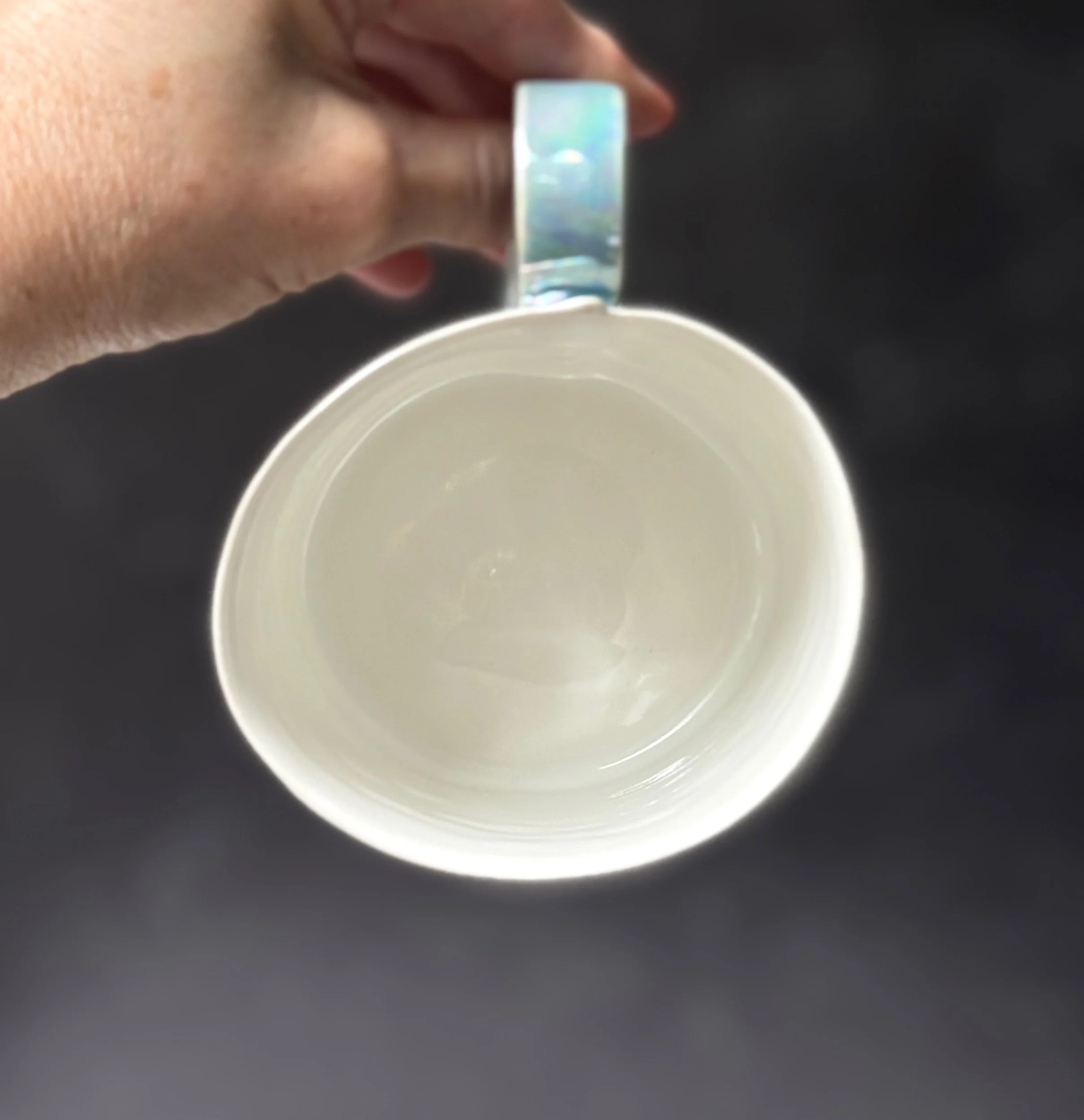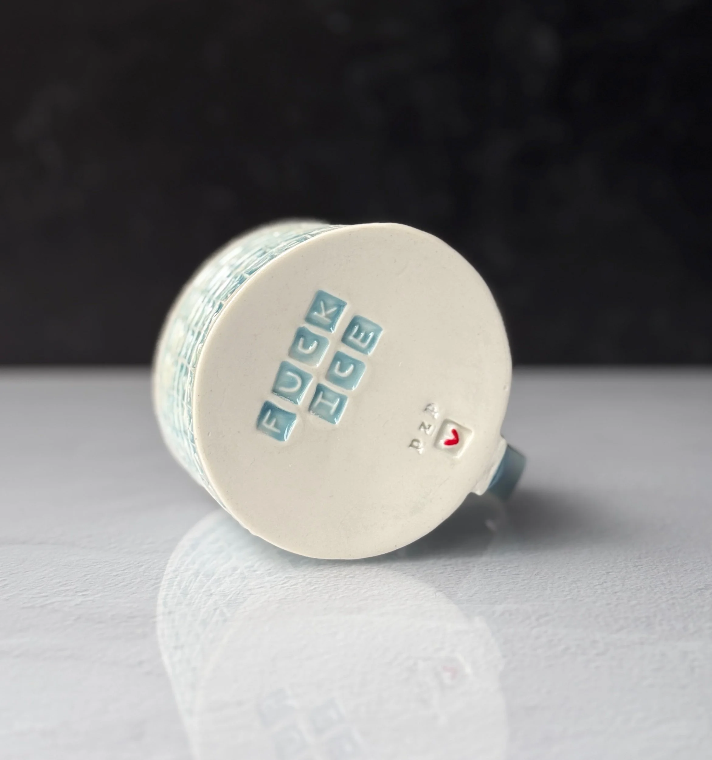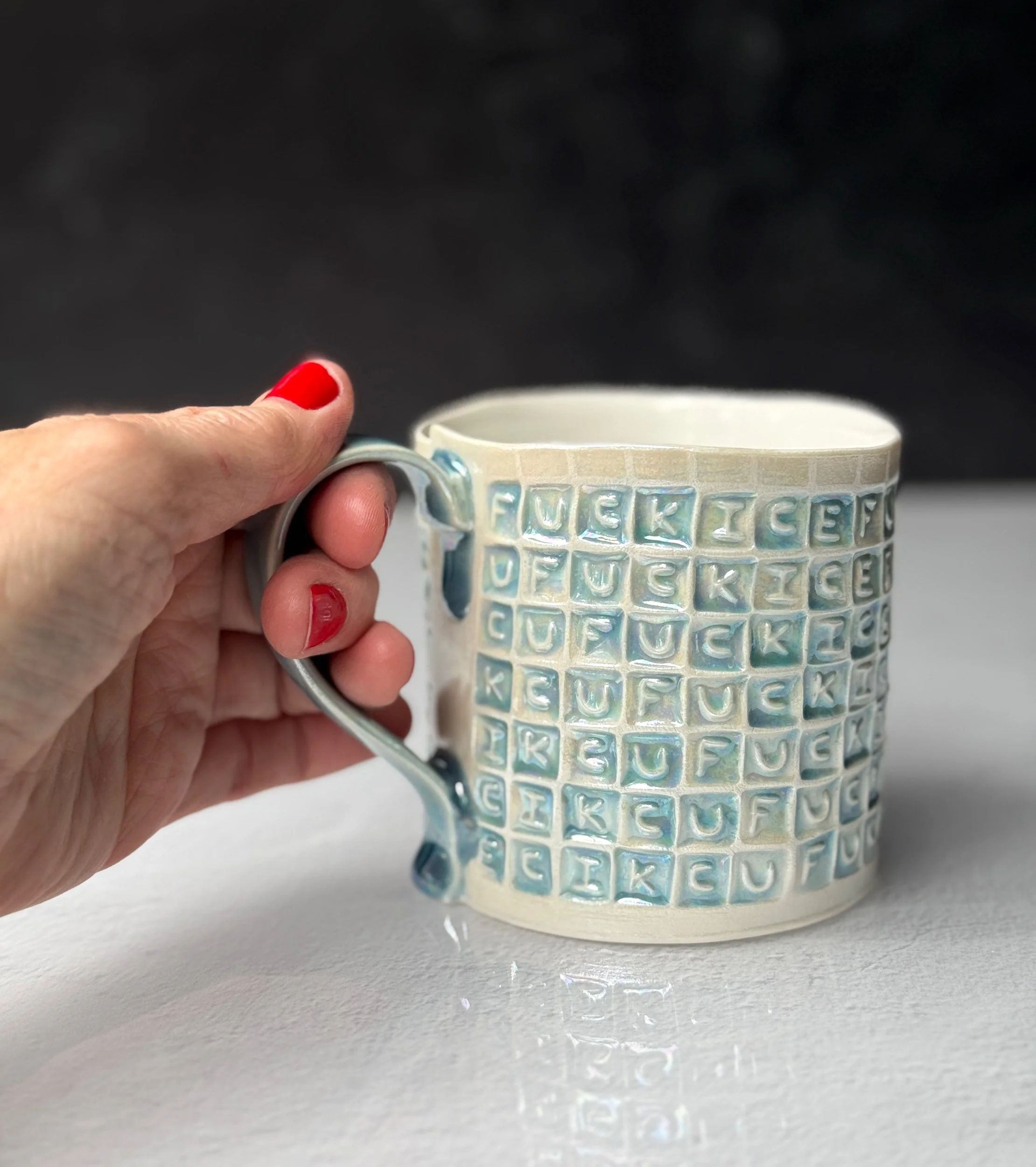 This mug has been hand built from translucent porcelain. The slab is first rolled out, printed with a newsprint transfer, and hand stamped, before being shaped into the mug form. After the first (bisque) firing, each square is filled with an icy blue celadon glaze, and then fired for a second time. To add that extra iridescent quality, the piece is then painted with mother-of-pearl luster, then fired for a third and final time.