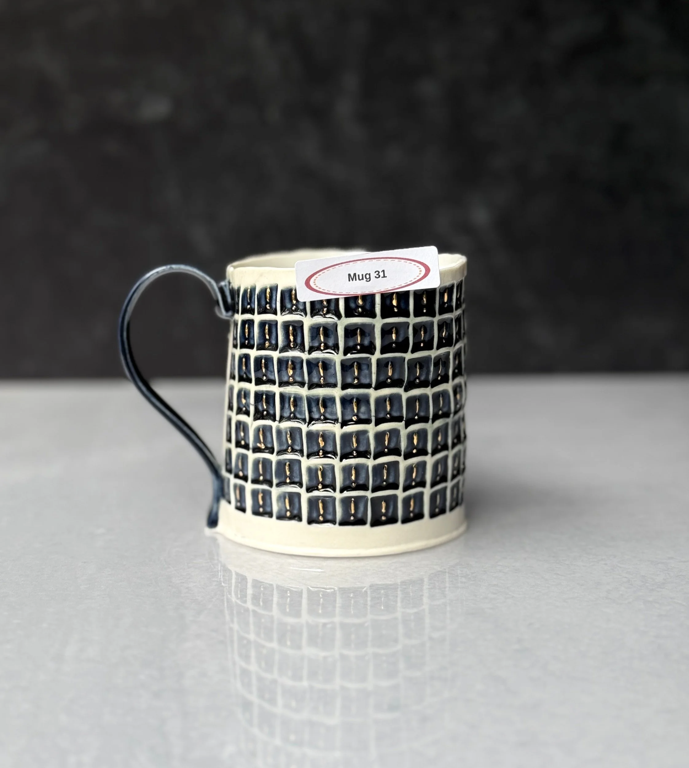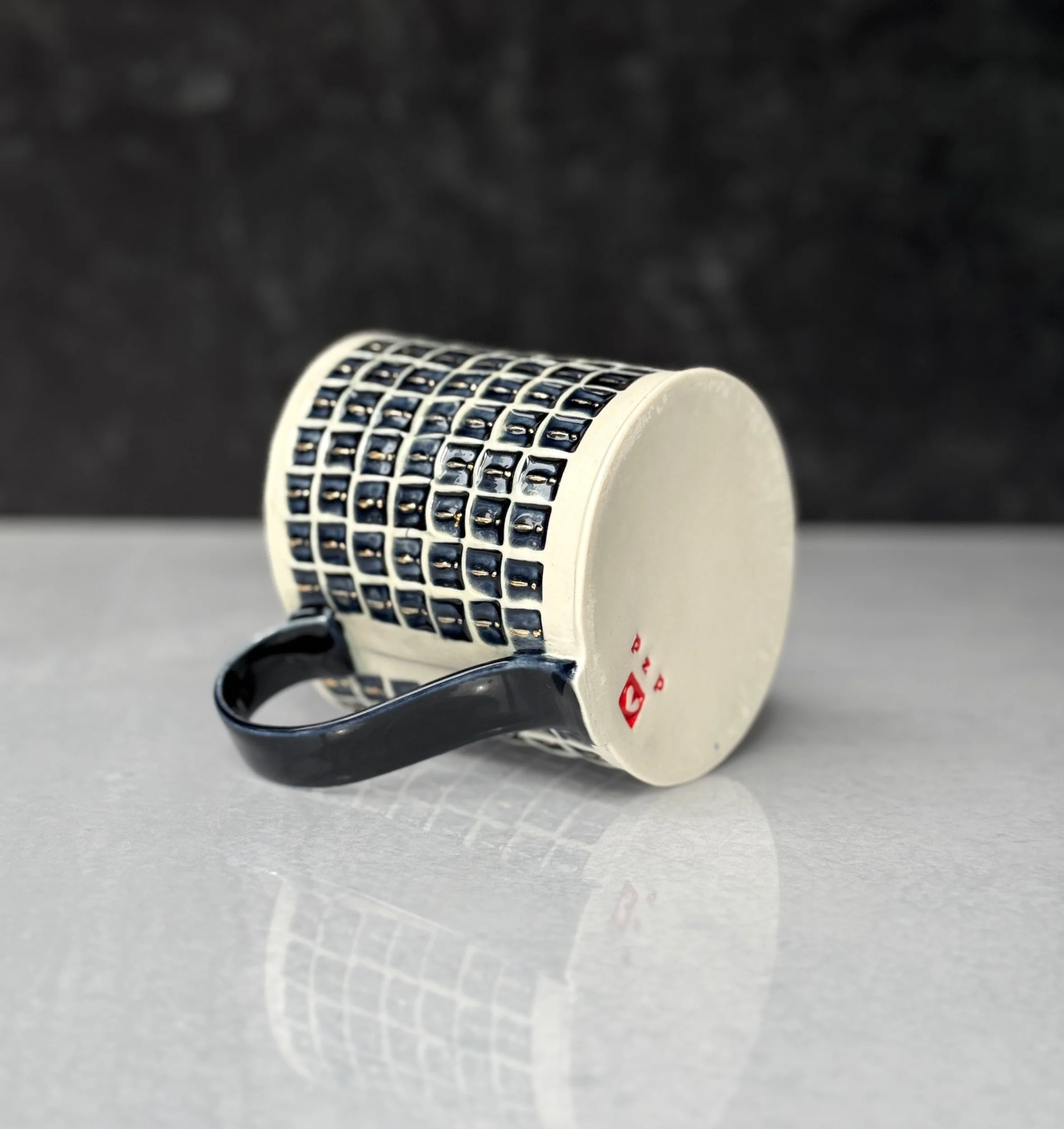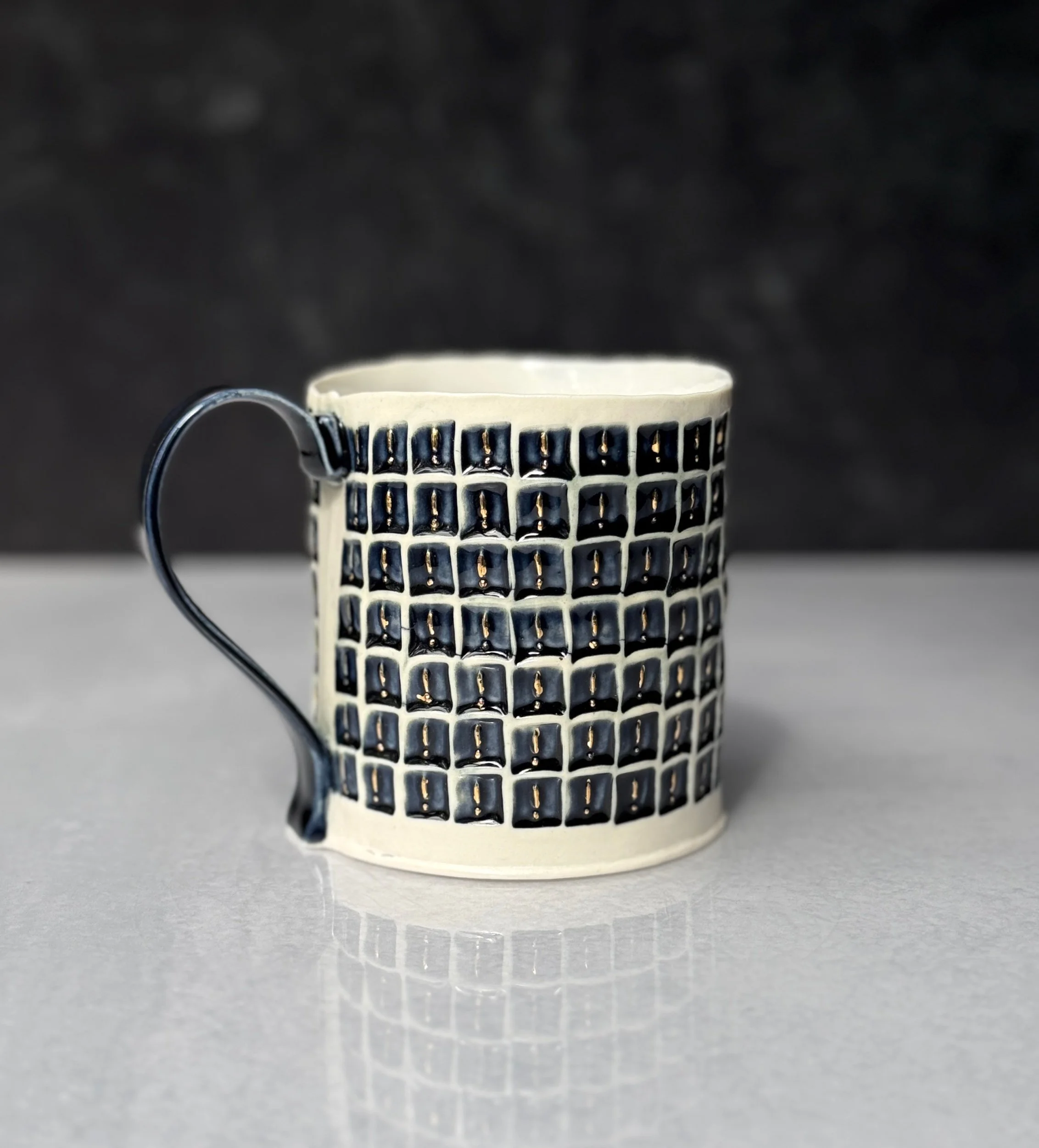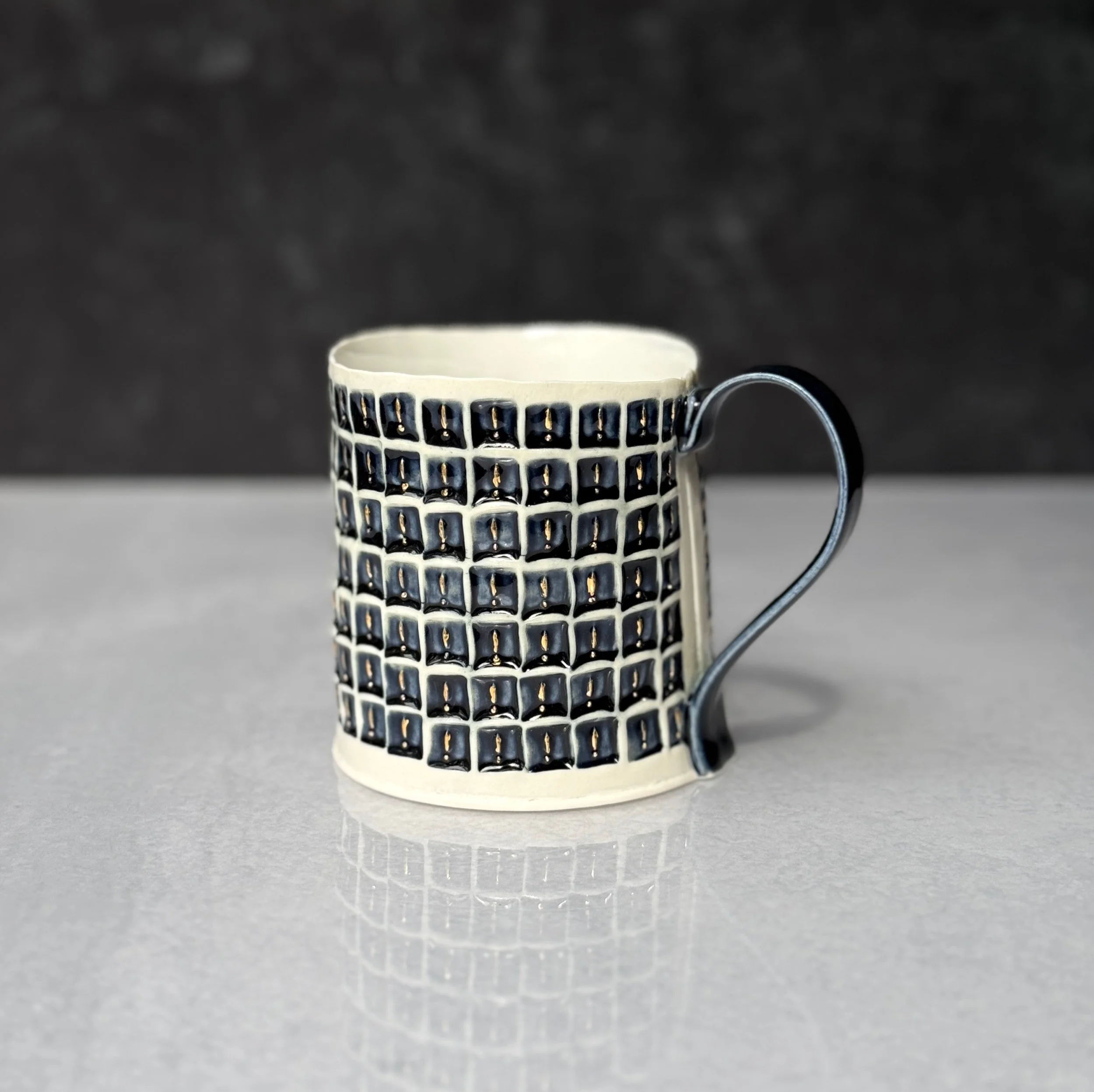 This mug has been hand built from translucent porcelain. The slab is first rolled out, printed with a newsprint transfer, and hand stamped, before being shaped into the mug form.  After the first (bisque) firing, each square is filled with an black celadon glaze, and the excess is gently wiped away so the stamped ! is revealed.  The handle is glazed in a complimentary black celadon glaze.  After the glaze firing, each !!! is hand painted with premium bright gold luster and fired for a third time.