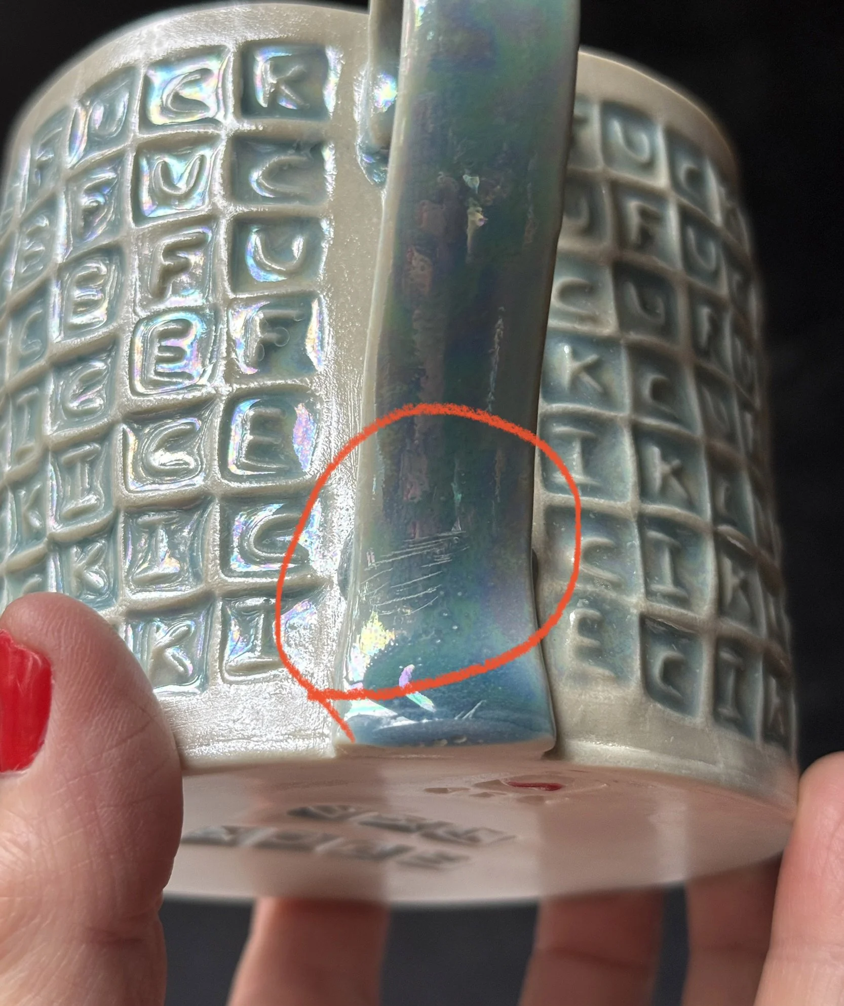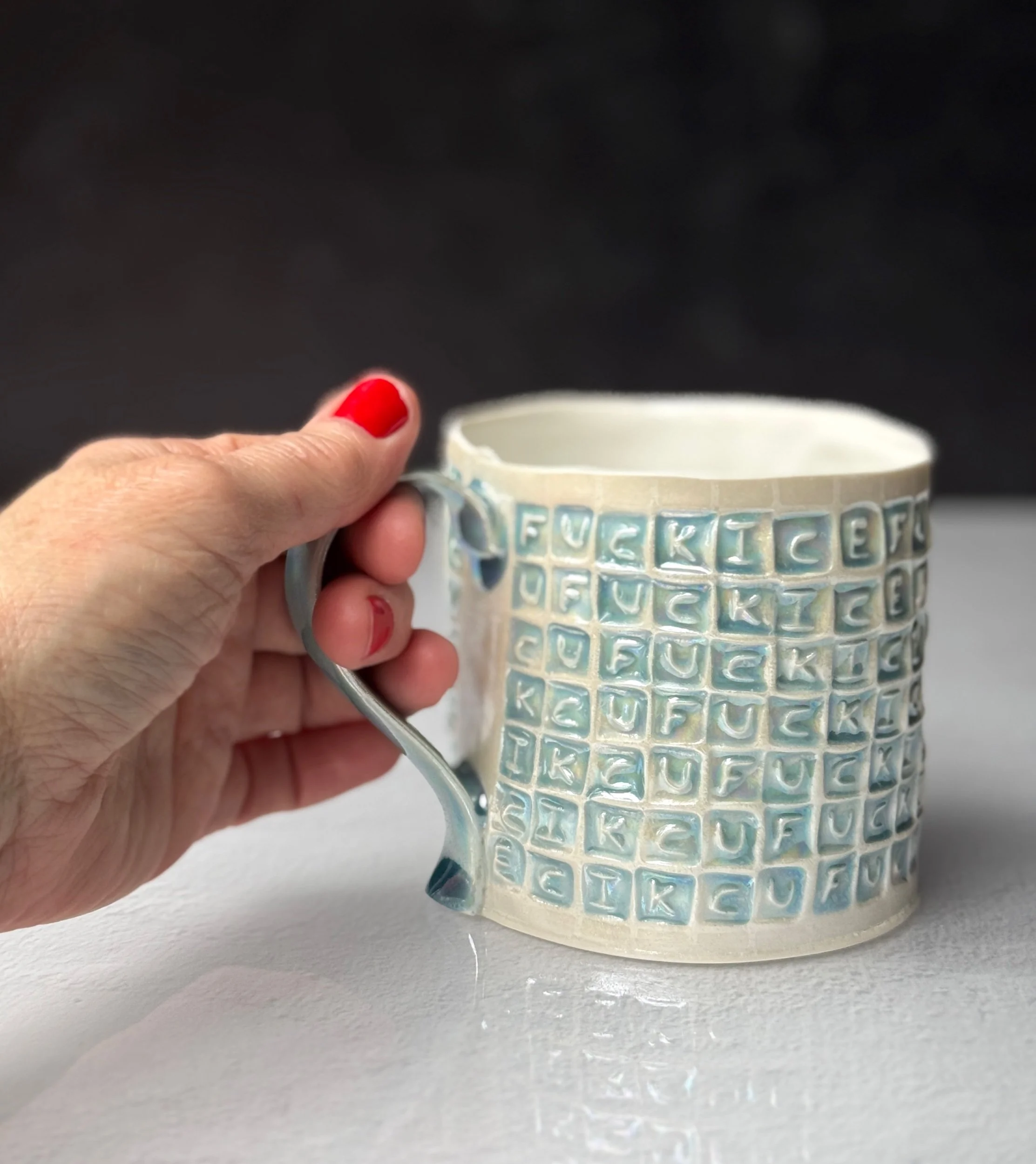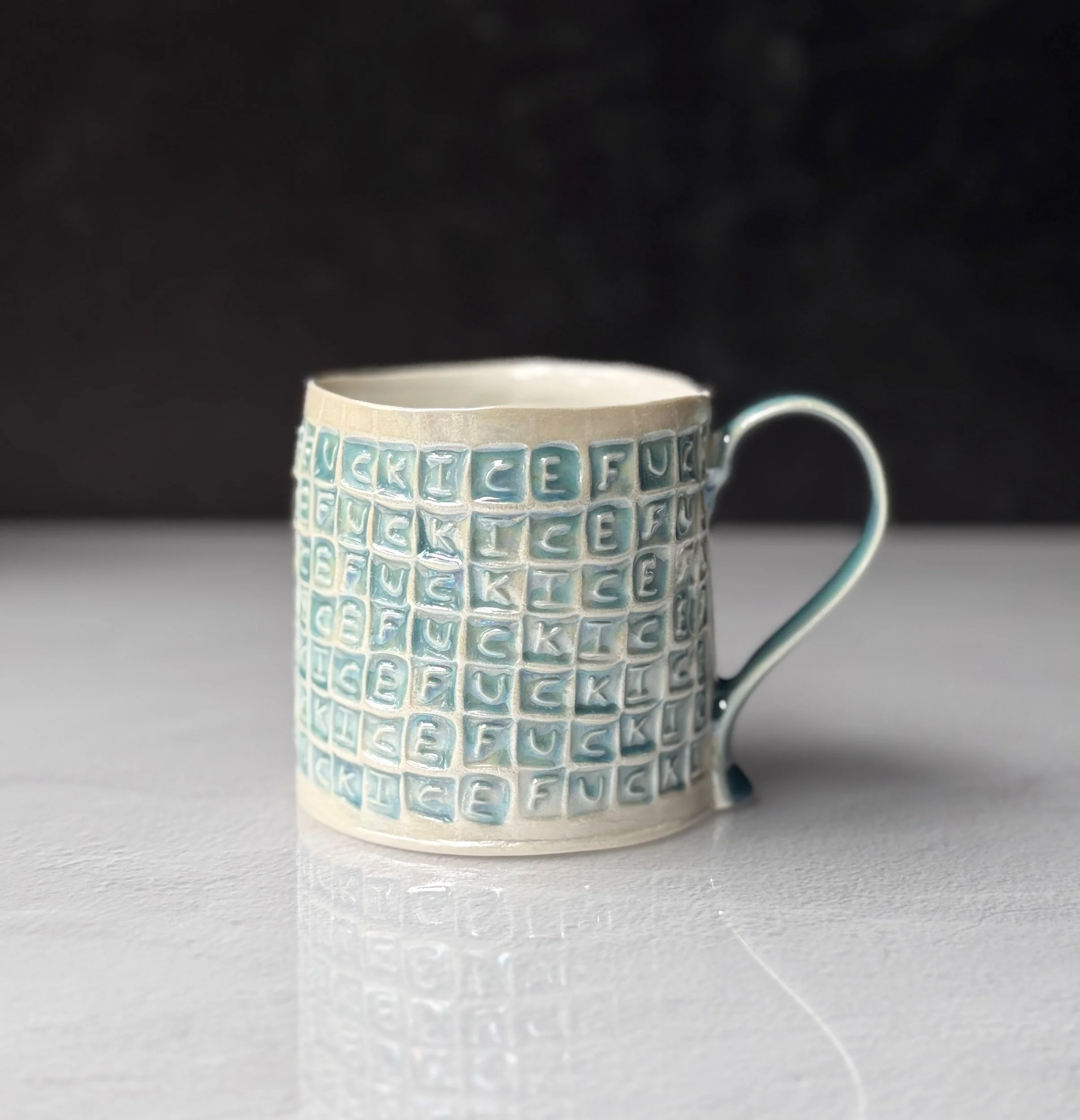 This mug has been hand built from translucent porcelain. The slab is first rolled out, printed with a newsprint transfer, and hand stamped, before being shaped into the mug form. After the first (bisque) firing, each square is filled with an icy blue celadon glaze, and then fired for a second time. To add that extra iridescent quality, the piece is then painted with mother-of-pearl luster, then fired for a third and final time. Mug holds approximately 14 oz of your favorite beverage.