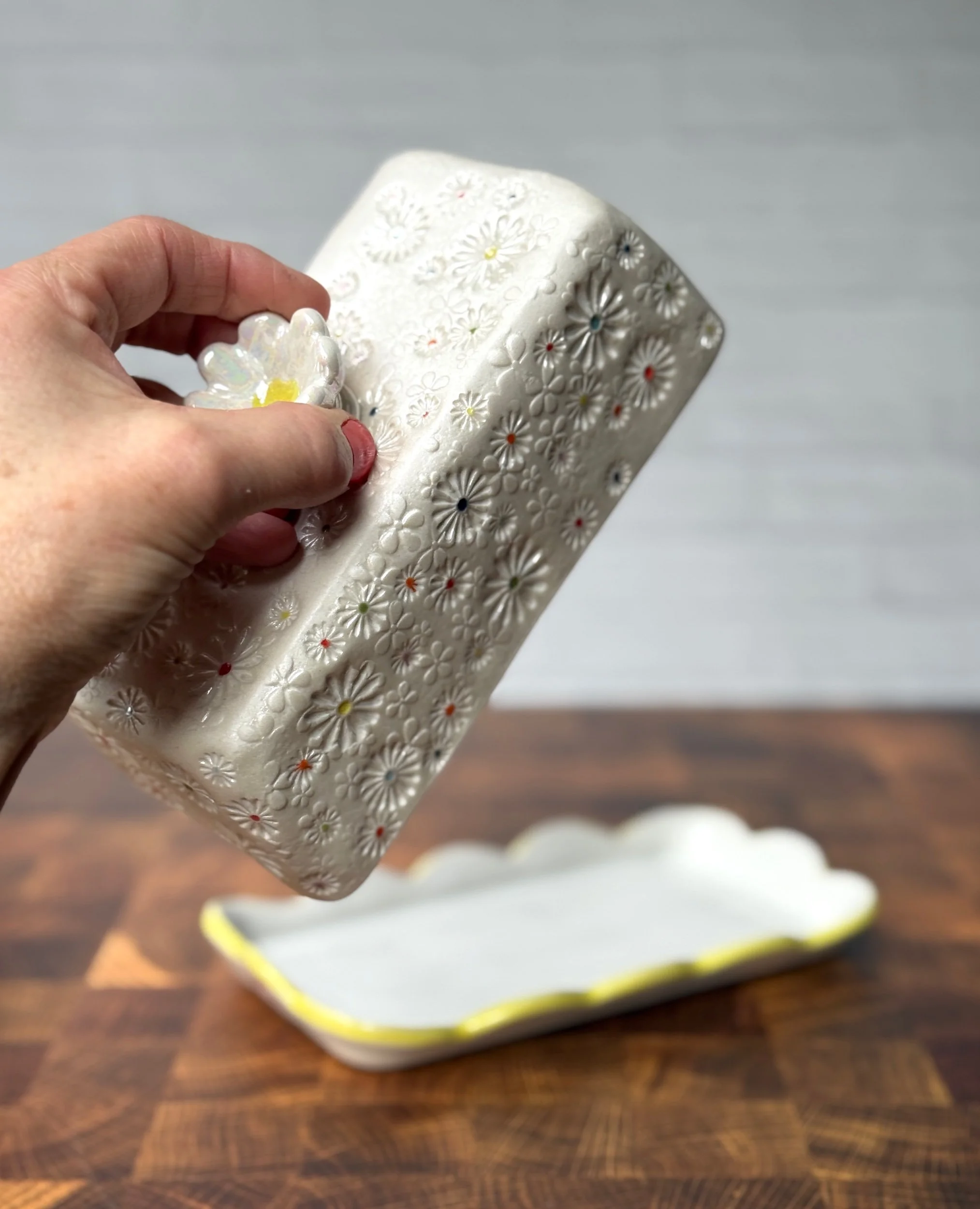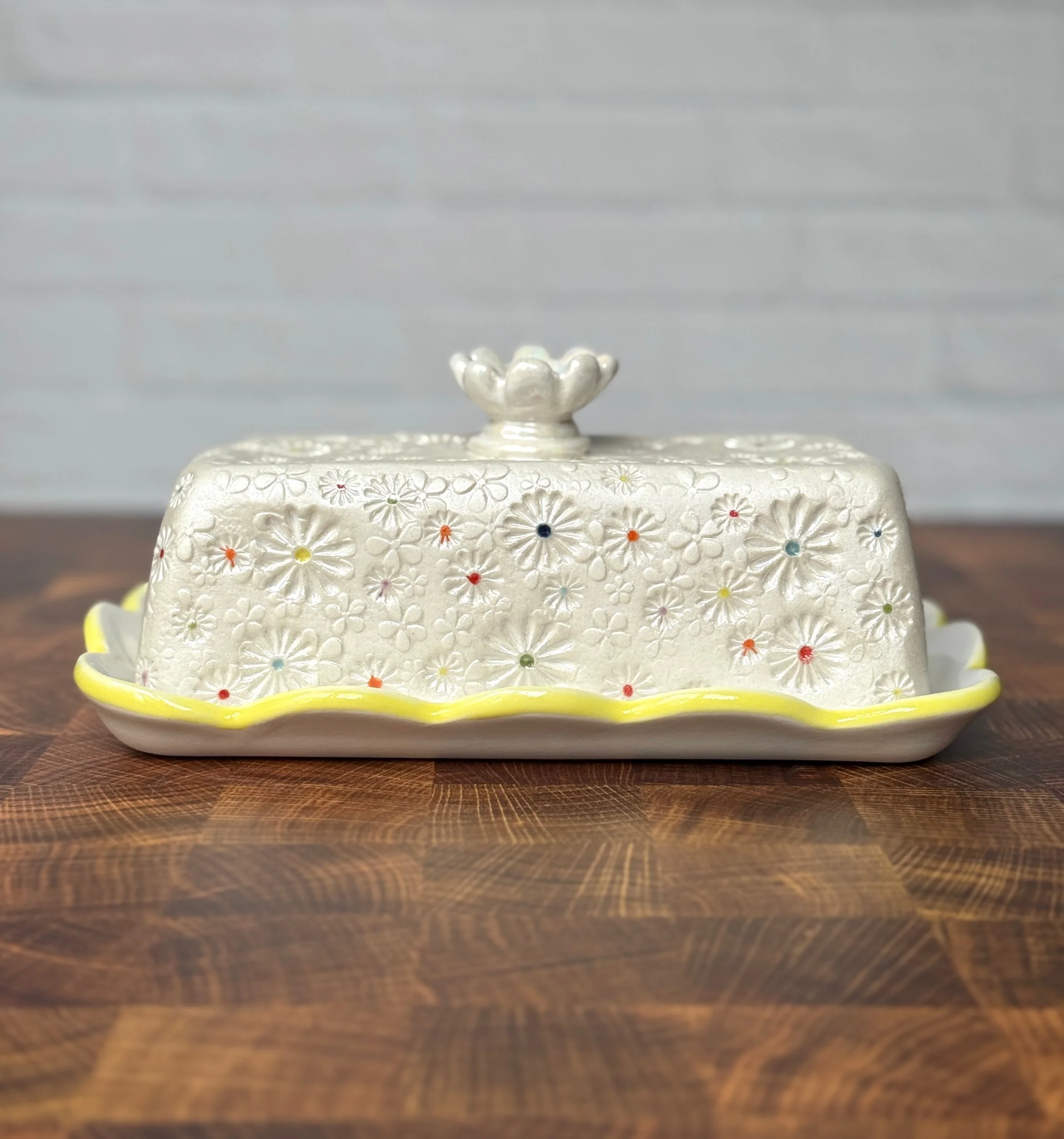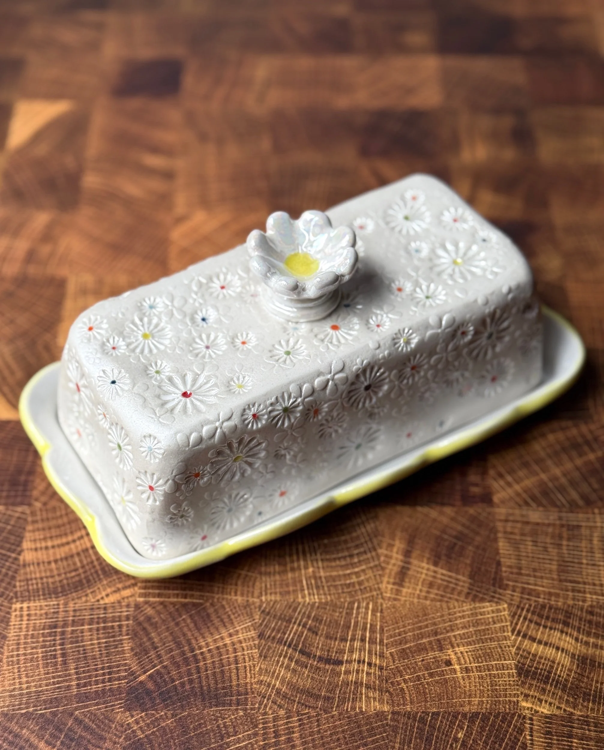Slab built from cone 10 porcelain, then hand stamped with layers of different sizes of daisies. The handle is a hand sculpted daisy. Once the piece has been bisque fired, each daisy is flooded with color provided by a variety of celadon glazes. This butter dish has also gone through an additional firing with mother of pearl luster.