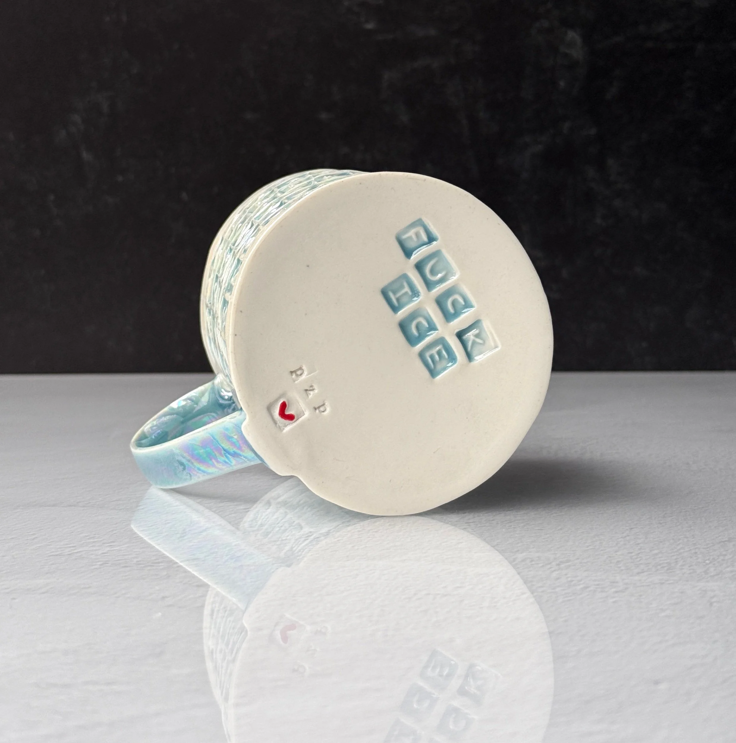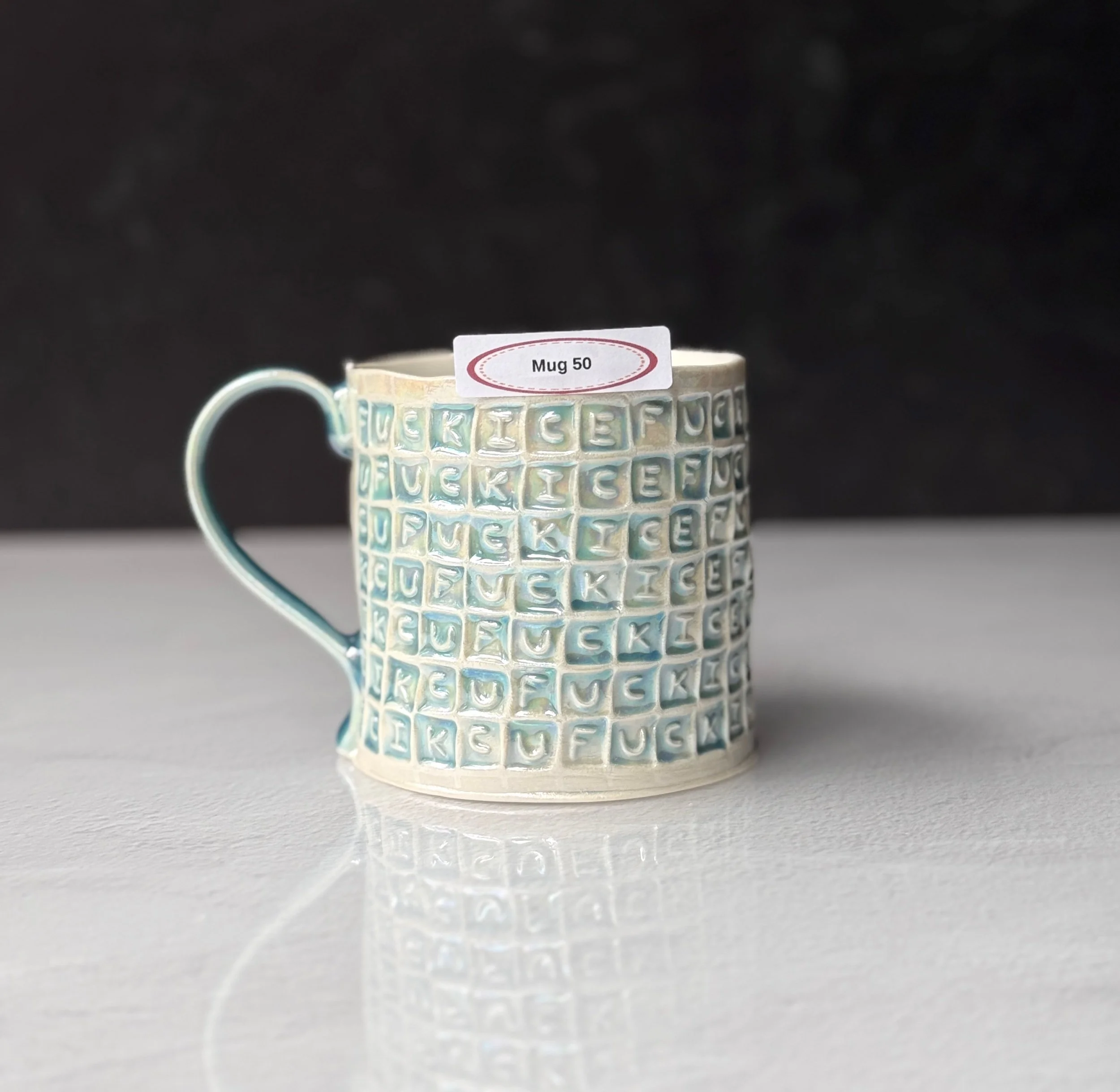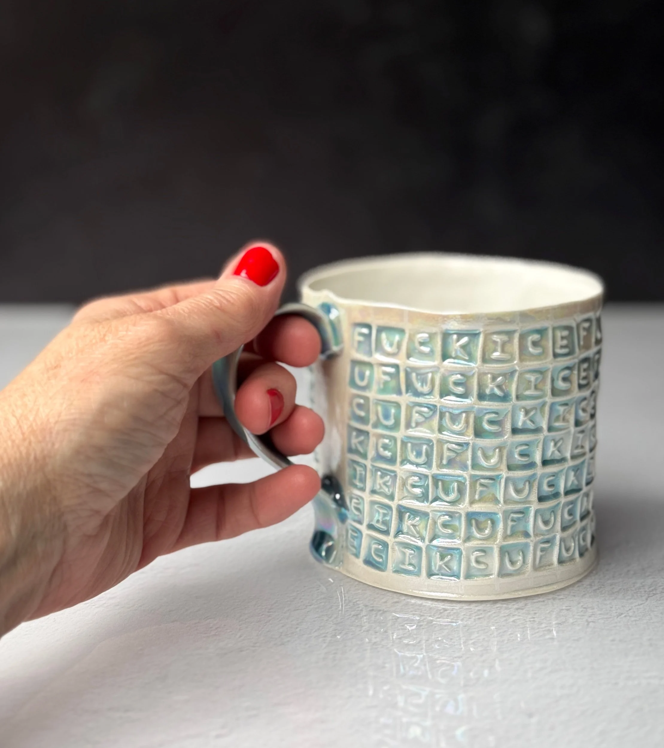 This mug has been hand built from translucent porcelain. The slab is first rolled out, printed with a newsprint transfer, and hand stamped, before being shaped into the mug form. After the first (bisque) firing, each square is filled with an icy blue celadon glaze, and then fired for a second time. To add that extra iridescent quality, the piece is then painted with mother-of-pearl luster, then fired for a third and final time.