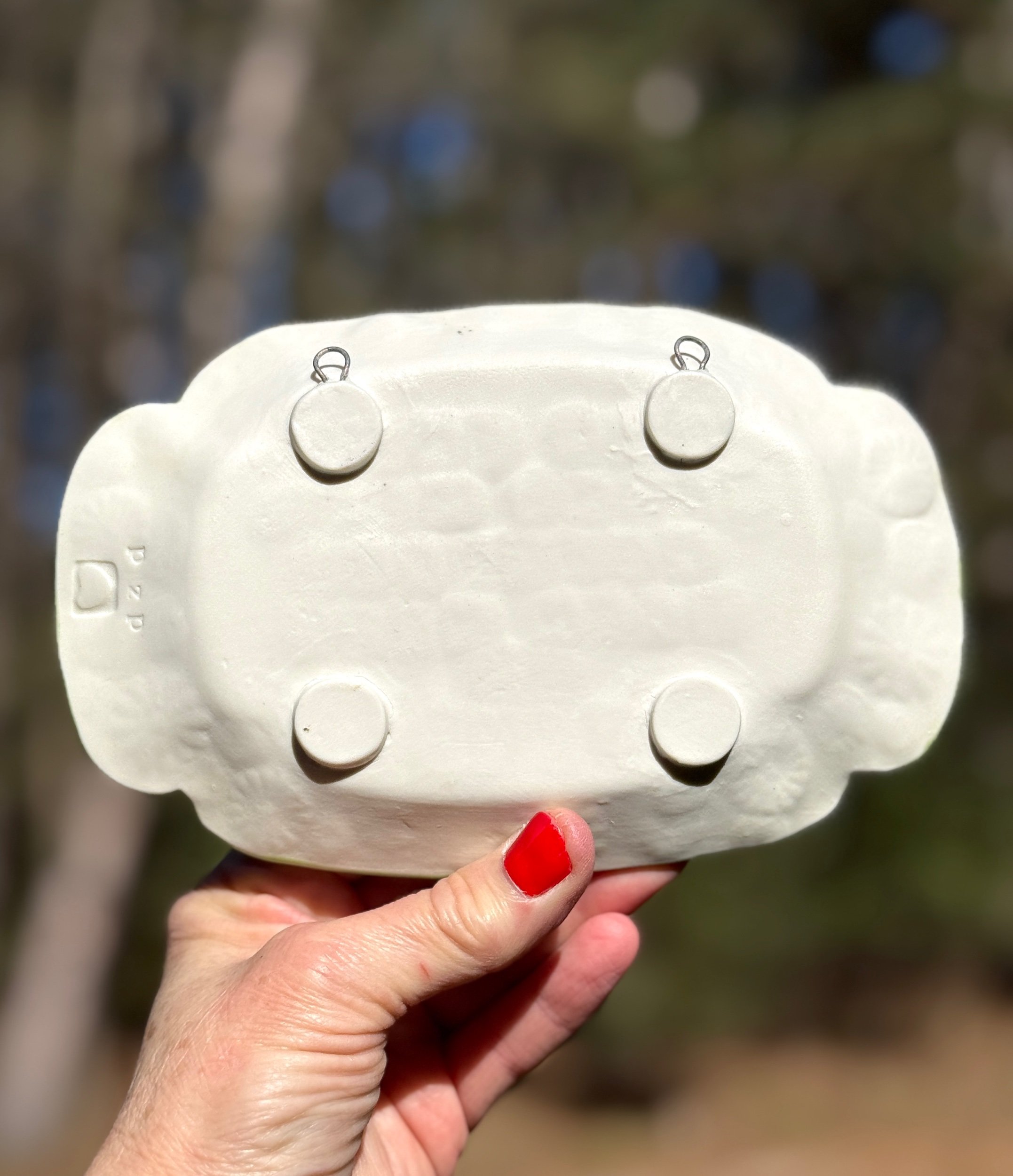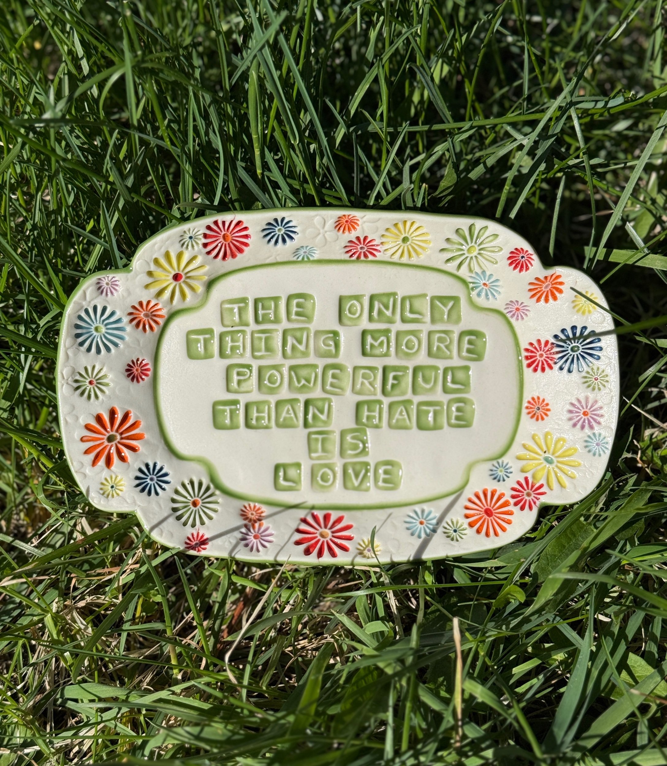 This piece was inspired by Bad Bunny’s amazing performance at the Super Bowl this past February.  I wanted to make a wall hanging with this message, but it can also be a little catch for your pocket change. The dish has small feet to raise it off of a surface, but also little hangers on the back to attach a ribbon to for display on your wall—or maybe by your front door?