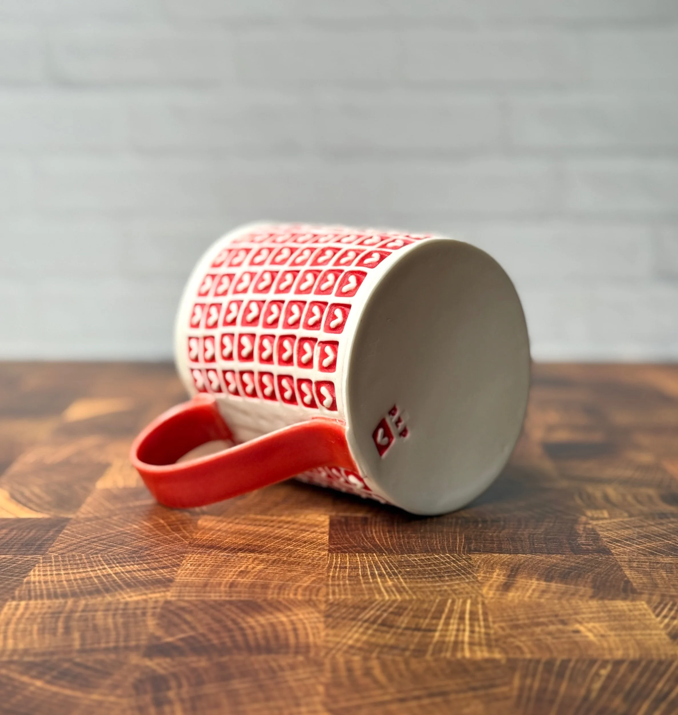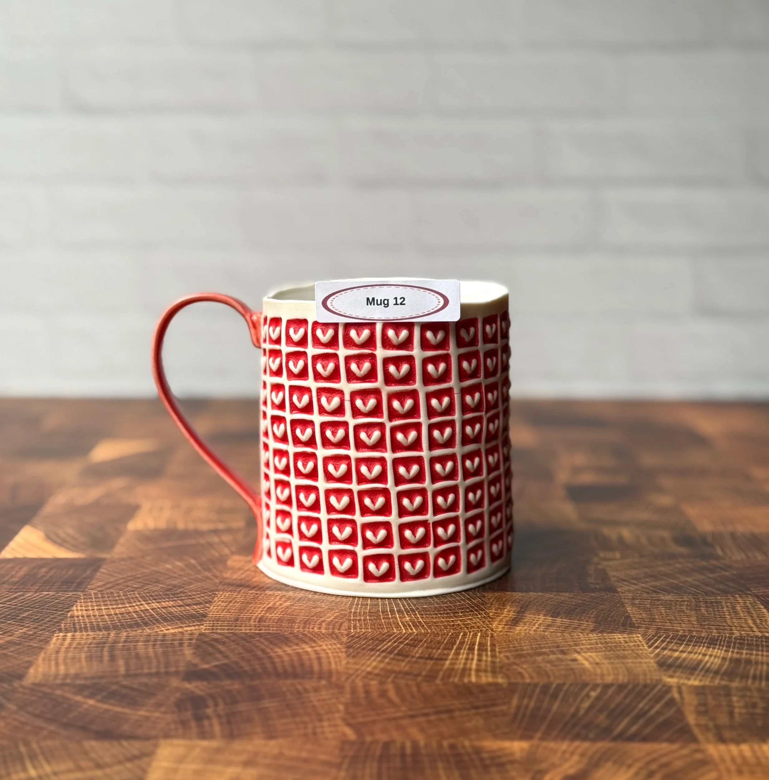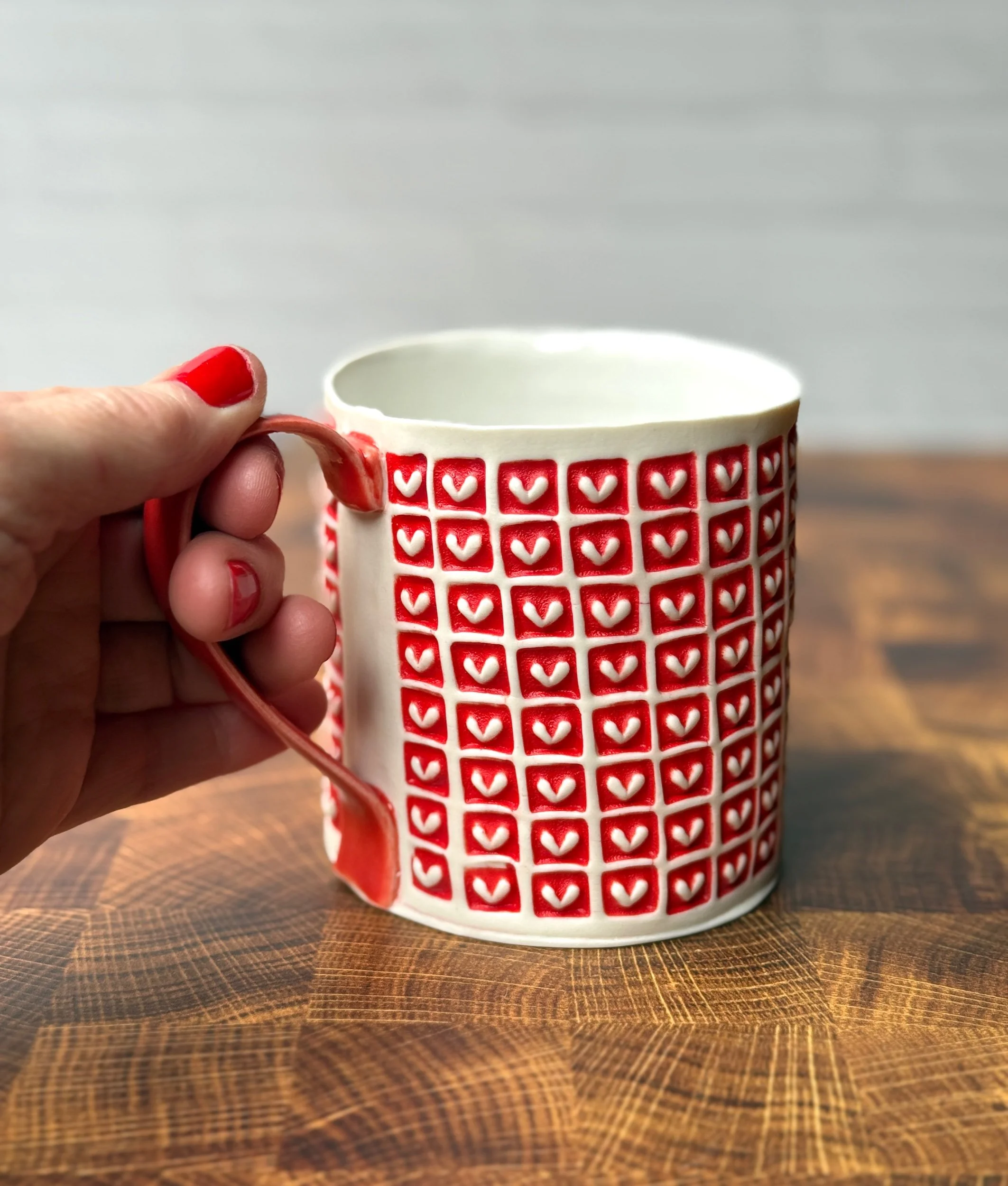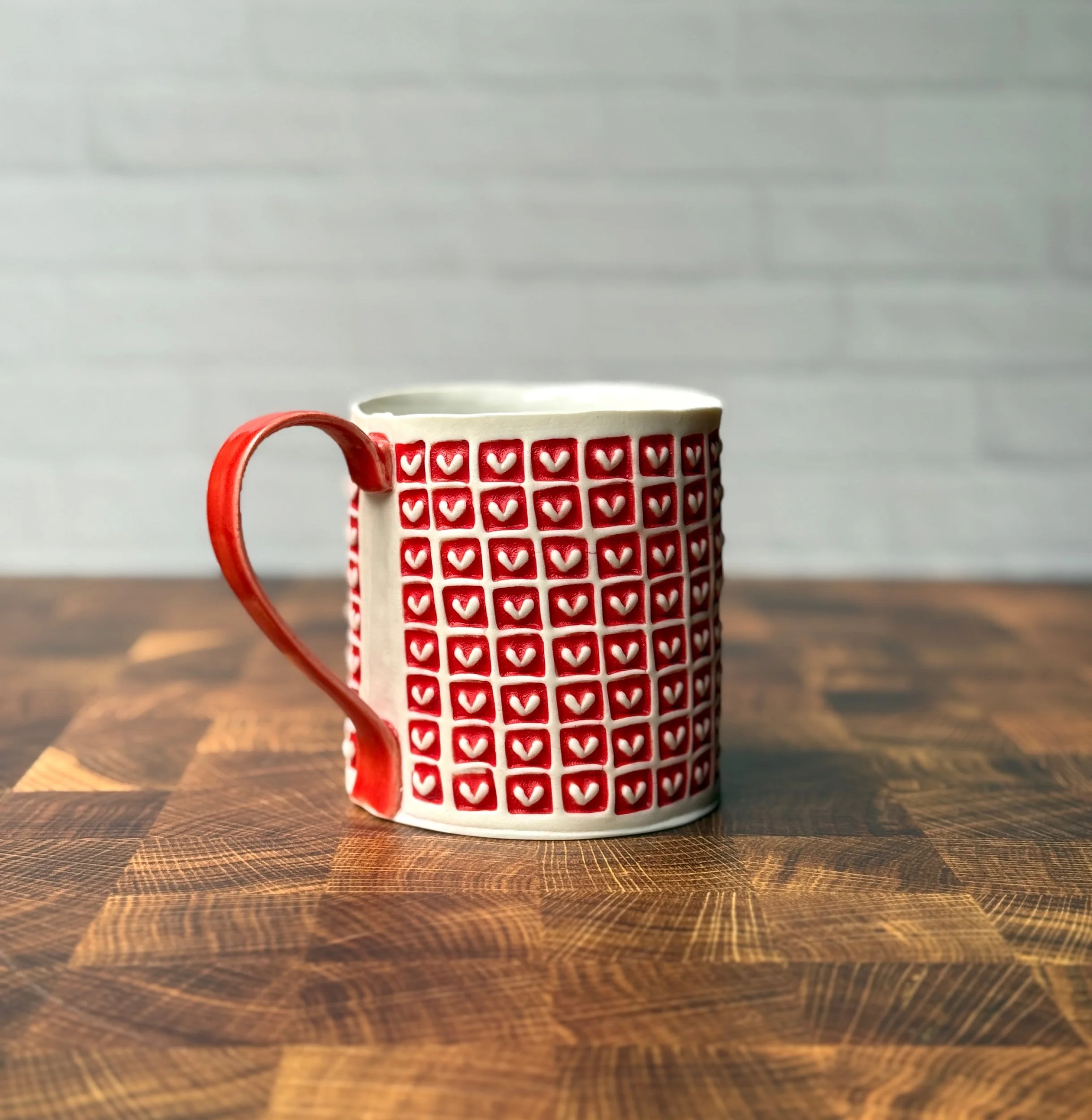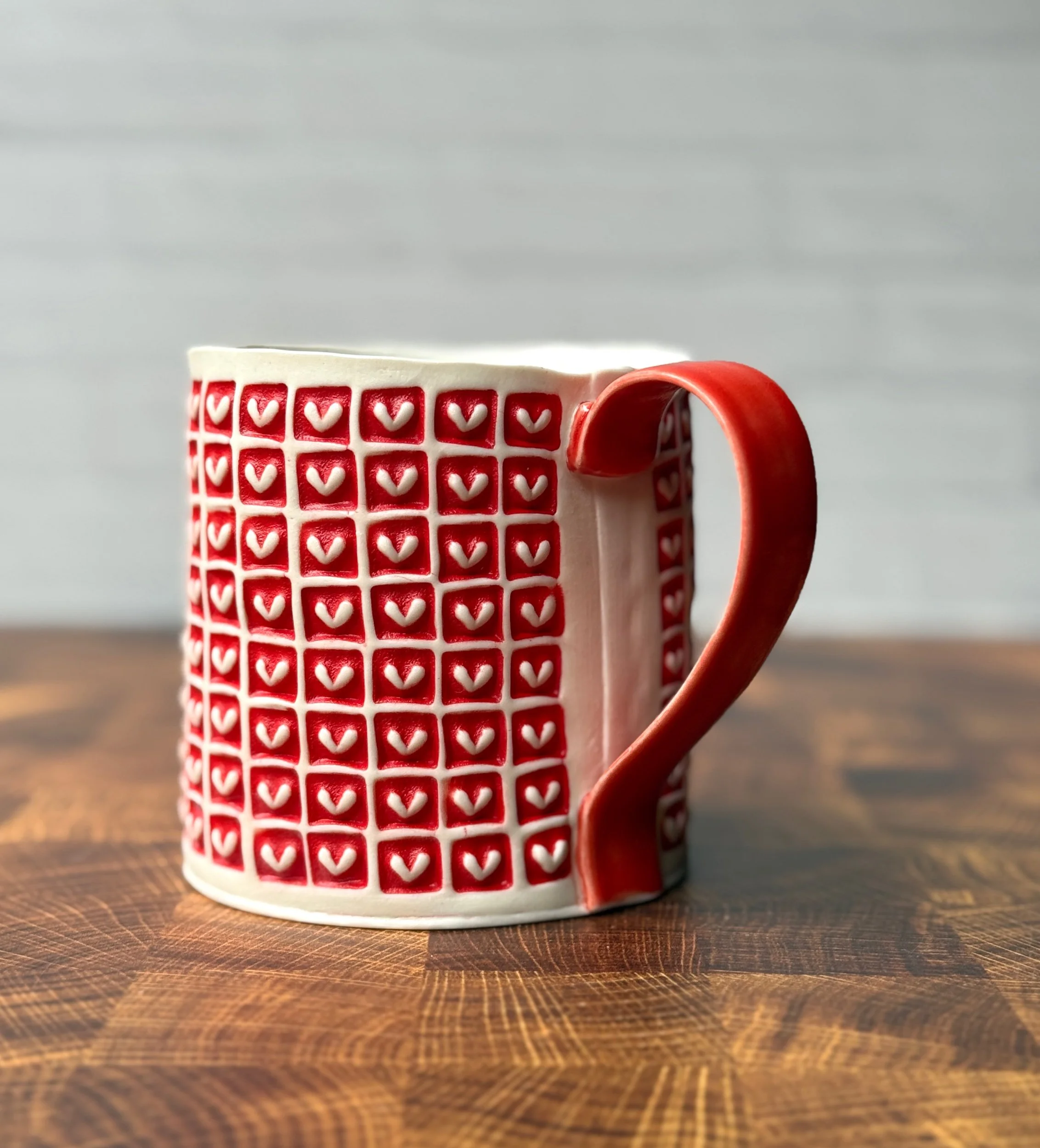 This mug has been hand built from translucent porcelain. The slab is first rolled out, printed with a newsprint transfer, and hand stamped, before being shaped into the mug form. After the first (bisque) firing, each square is filled with a radiant red glaze, making the white of the porcelain hearts stand out in high contrast. The handle is glazed in a similar eye catching red glaze