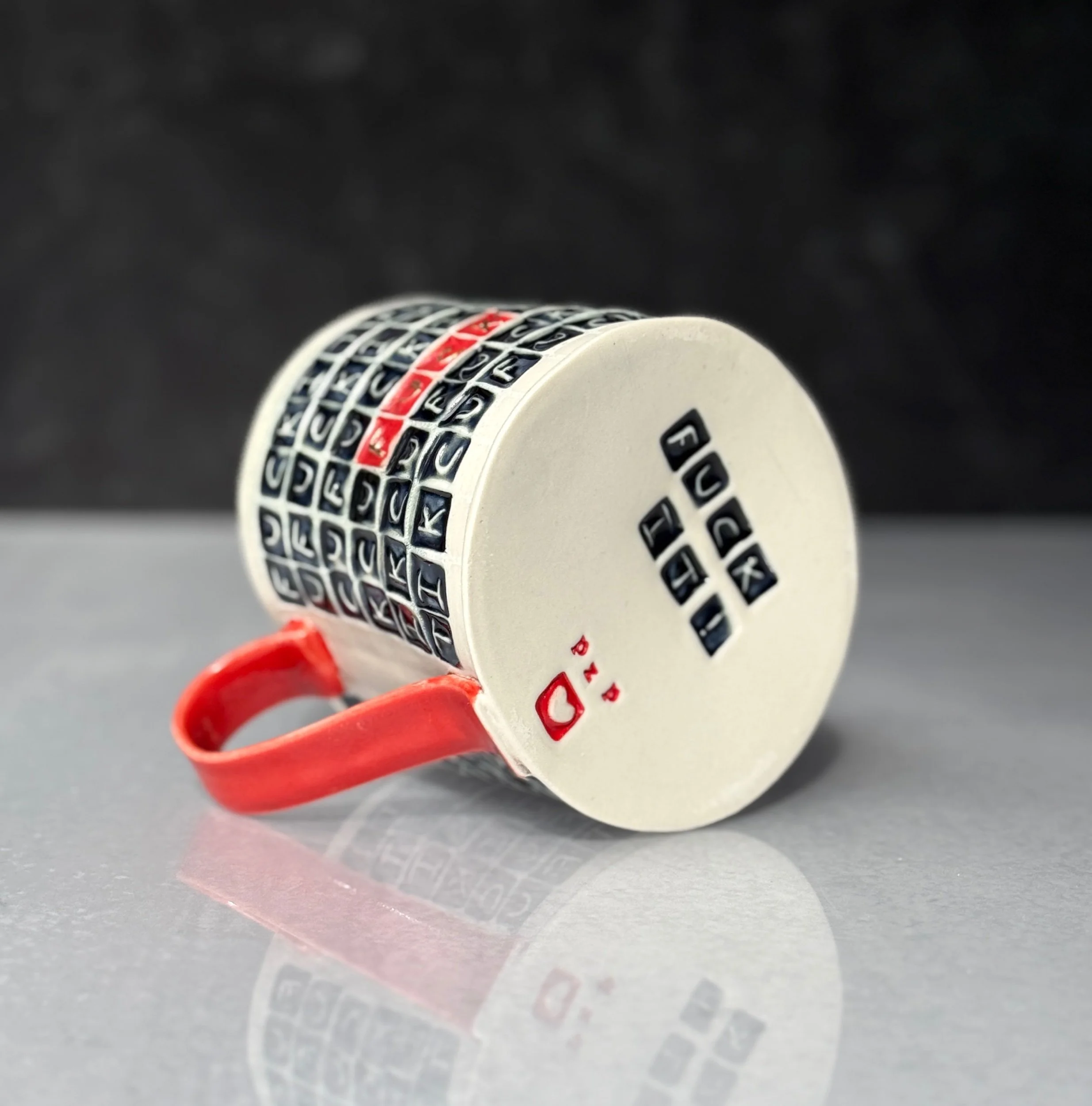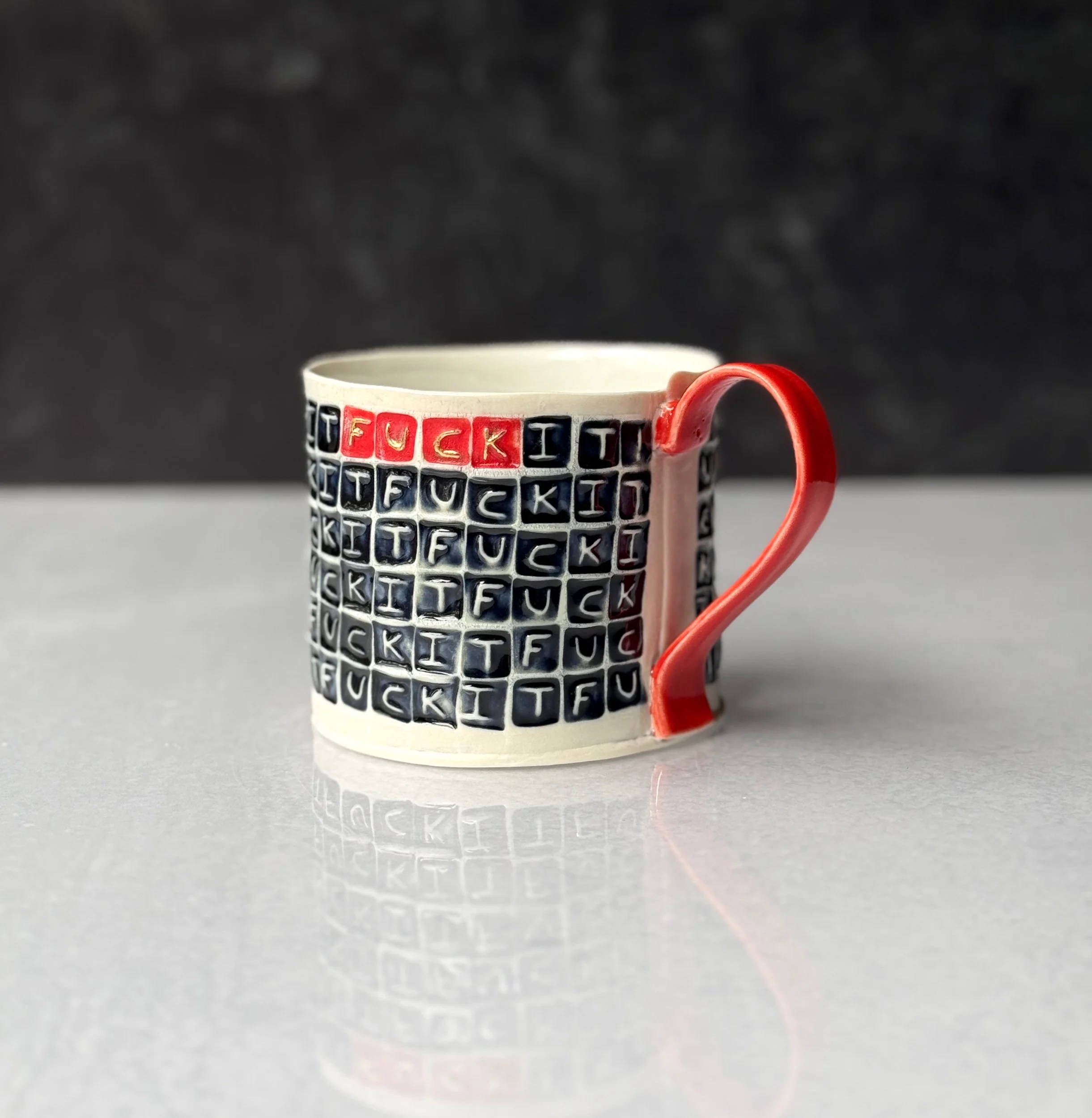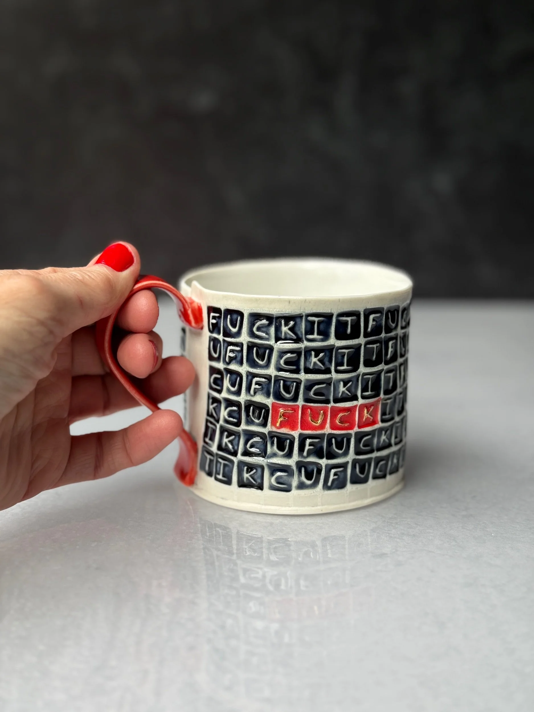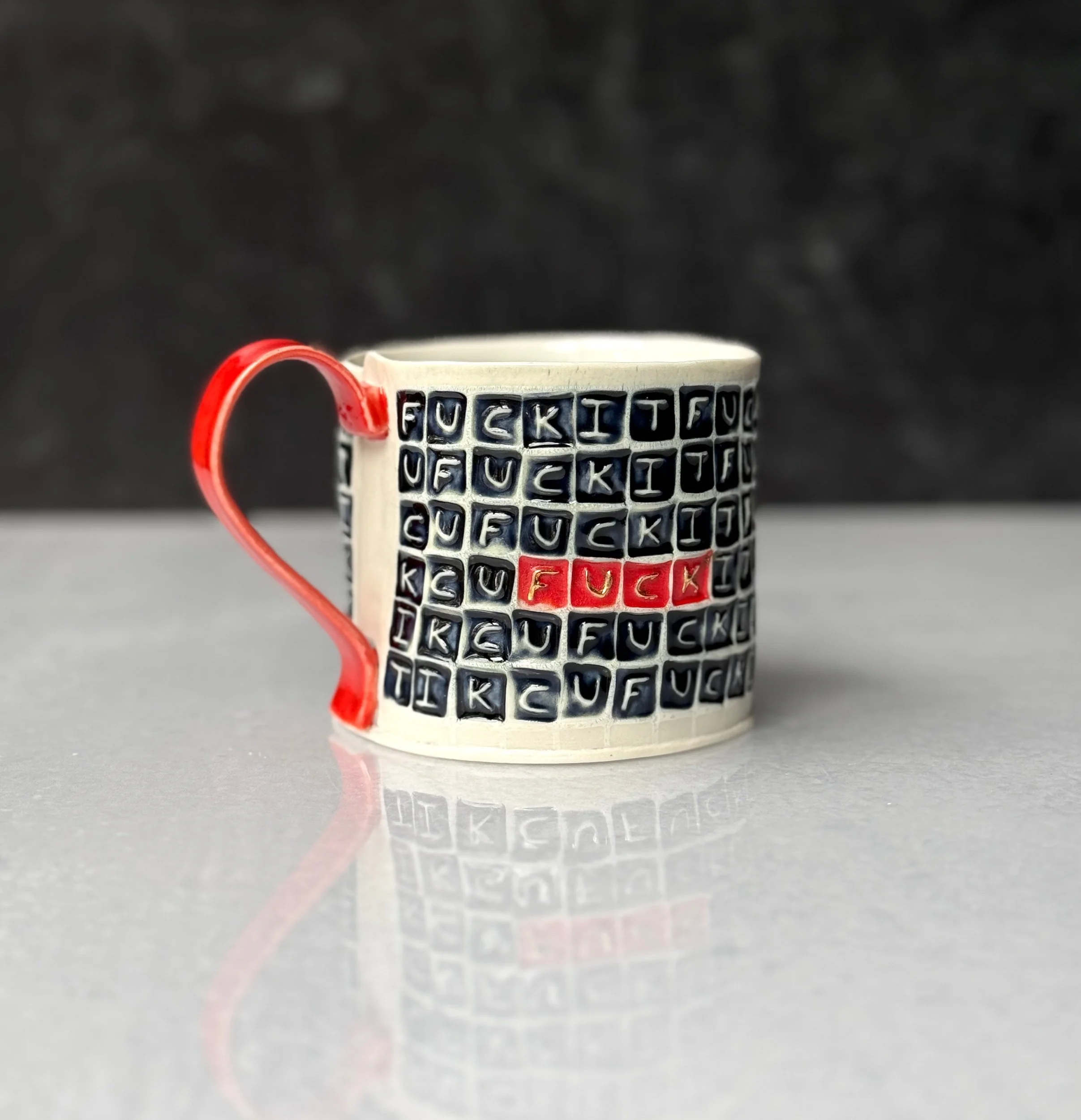 This mug has been hand built from translucent porcelain. The slab is first rolled out, printed with a newsprint transfer, and hand stamped, before being shaped into the mug form.  After the first (bisque) firing, each square is filled with a black celadon glaze, and the excess is gently wiped away to reveal the words.  In this design I have highlighted the word “FUCK” in three places around the body of the mug in the fiery color of red.  The handle is glazed in a complimentary red glaze.  After the glaze firing, the a selection of the “FUCK”’s are hand painted with premium bright gold luster and fired for a third time.