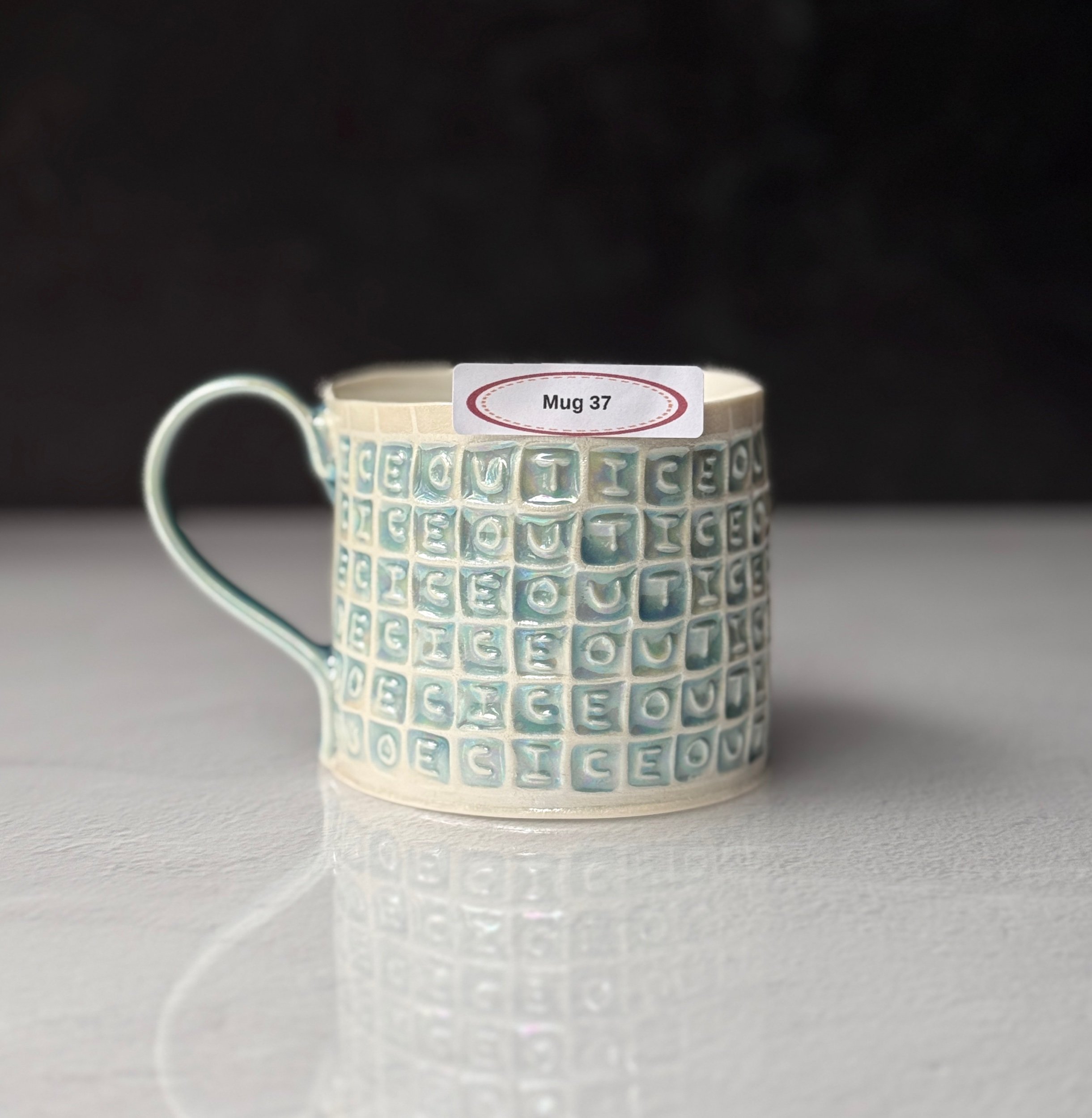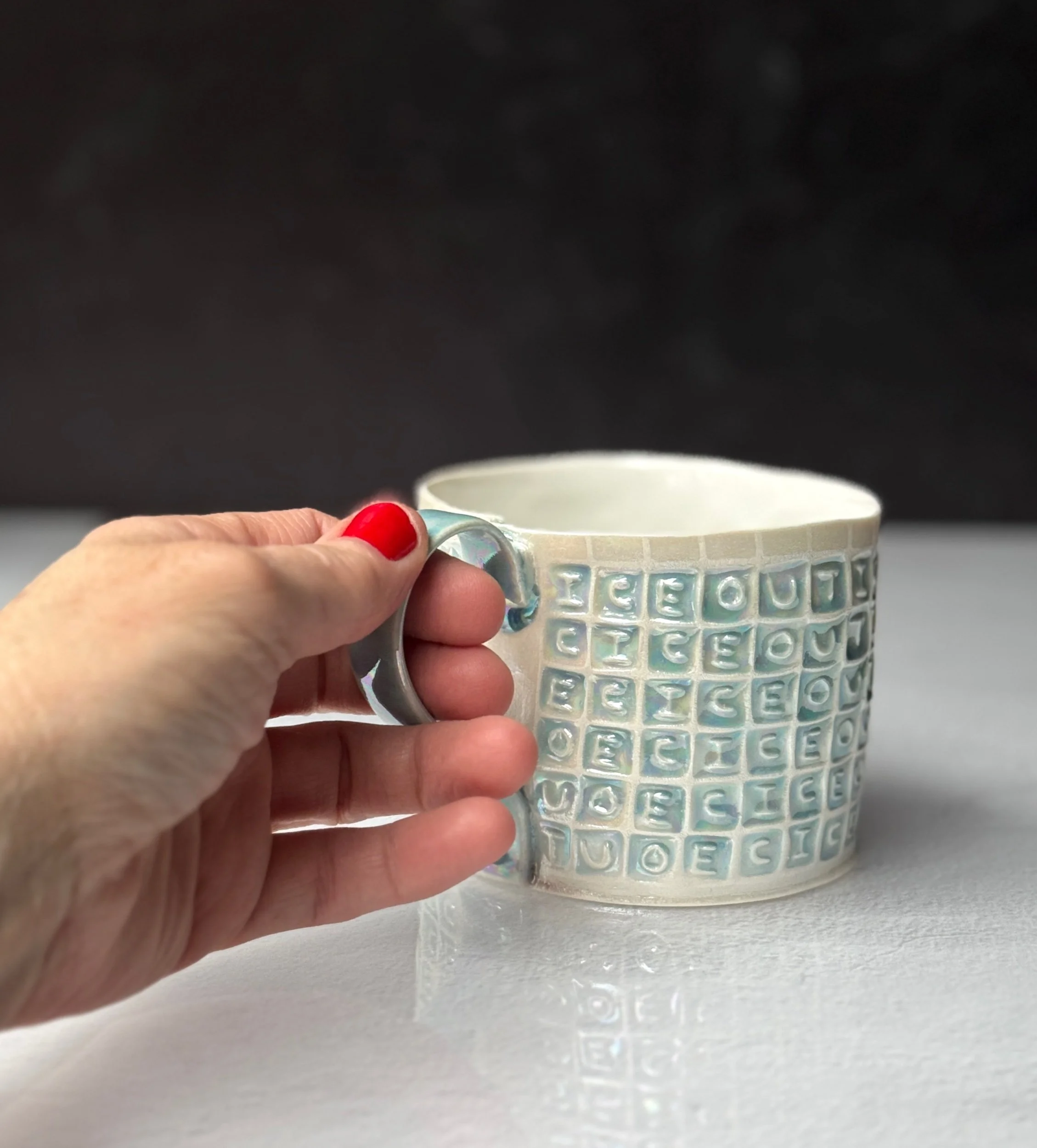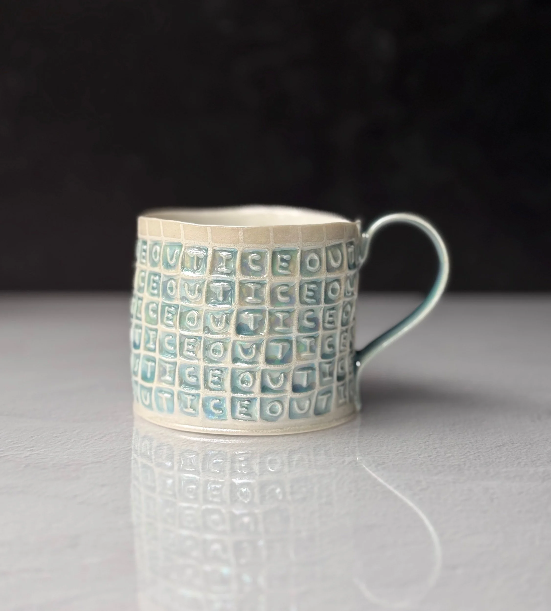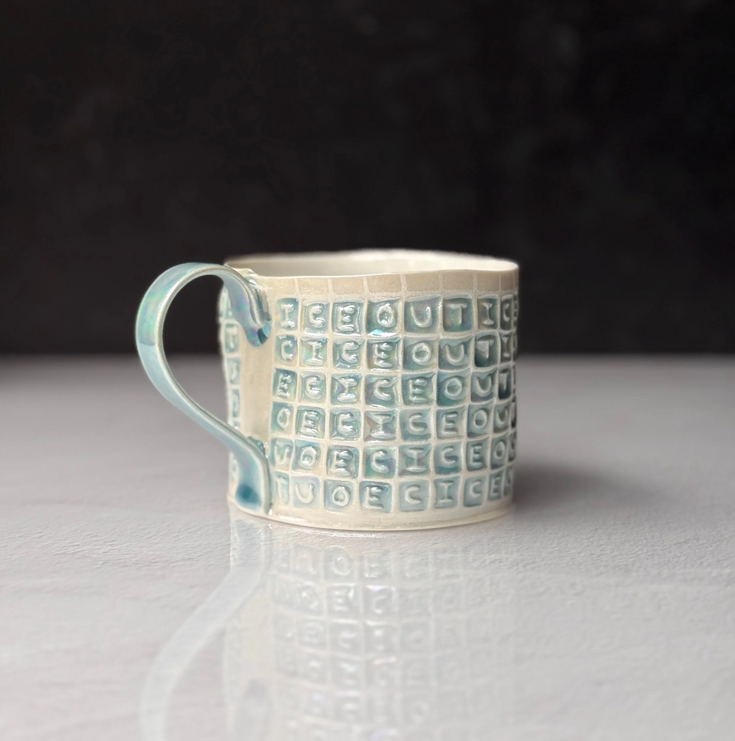 This mug has been hand built from translucent porcelain. The slab is first rolled out, printed with a newsprint transfer, and hand stamped, before being shaped into the mug form. After the first (bisque) firing, each square is filled with an icy blue celadon glaze, and then fired for a second time. To add that extra iridescent quality, the piece is then painted with mother-of-pearl luster, then fired for a third and final time.
