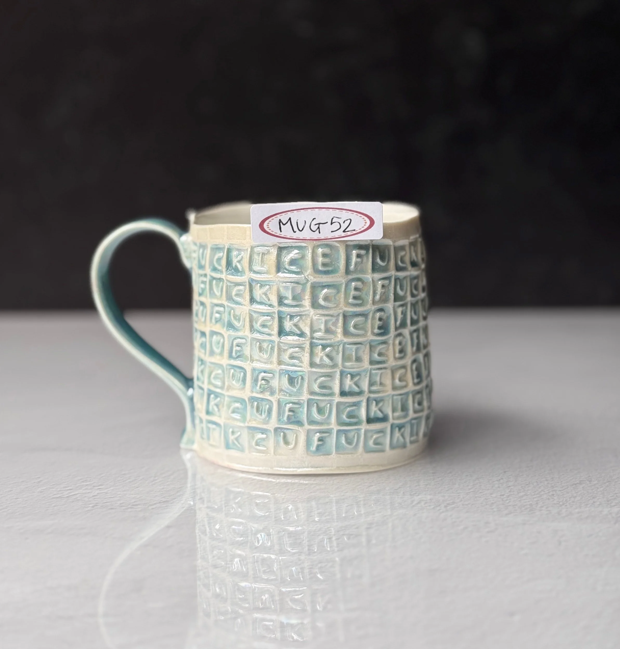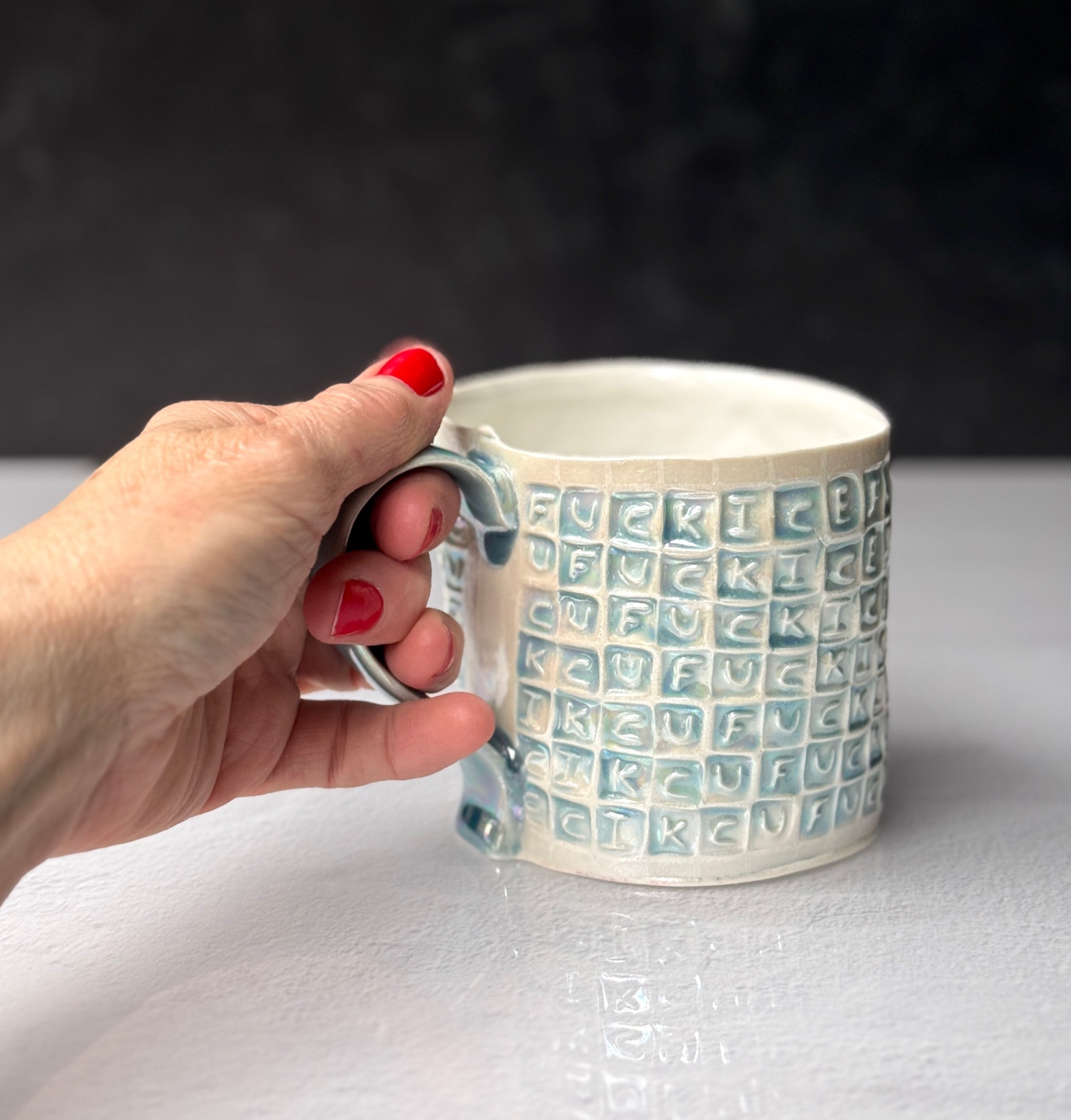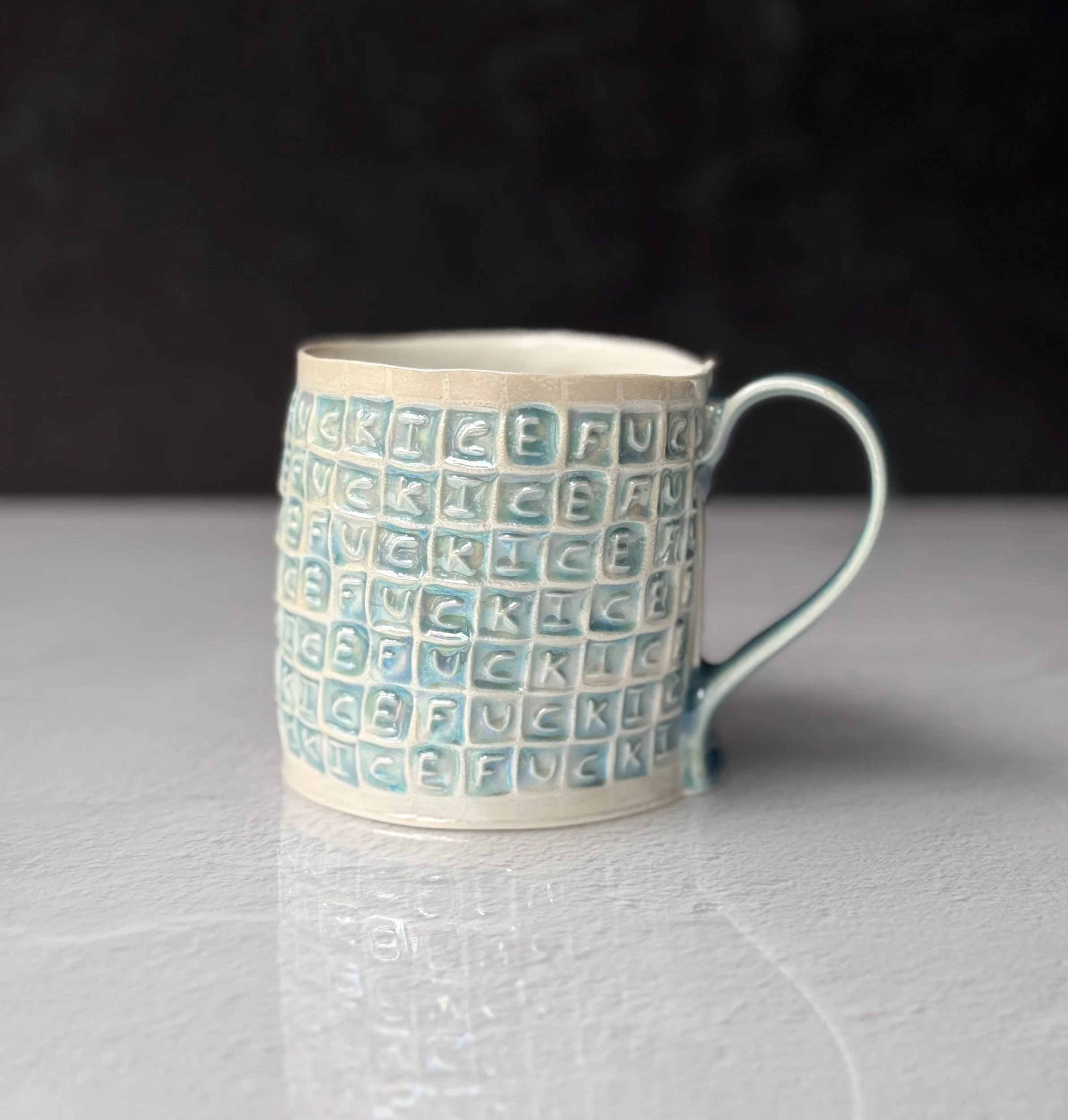 This mug has been hand built from translucent porcelain. The slab is first rolled out, printed with a newsprint transfer, and hand stamped, before being shaped into the mug form. After the first (bisque) firing, each square is filled with an icy blue celadon glaze, and then fired for a second time. To add that extra iridescent quality, the piece is then painted with mother-of-pearl luster, then fired for a third and final time.