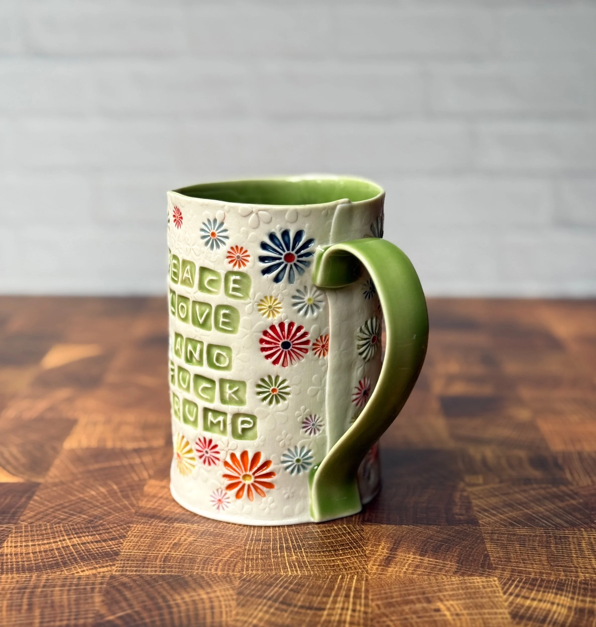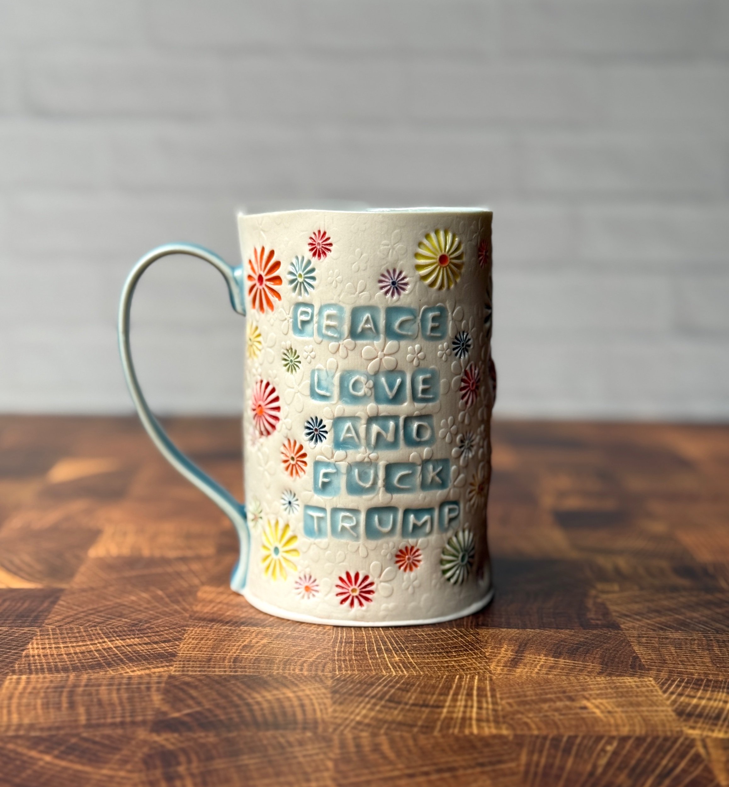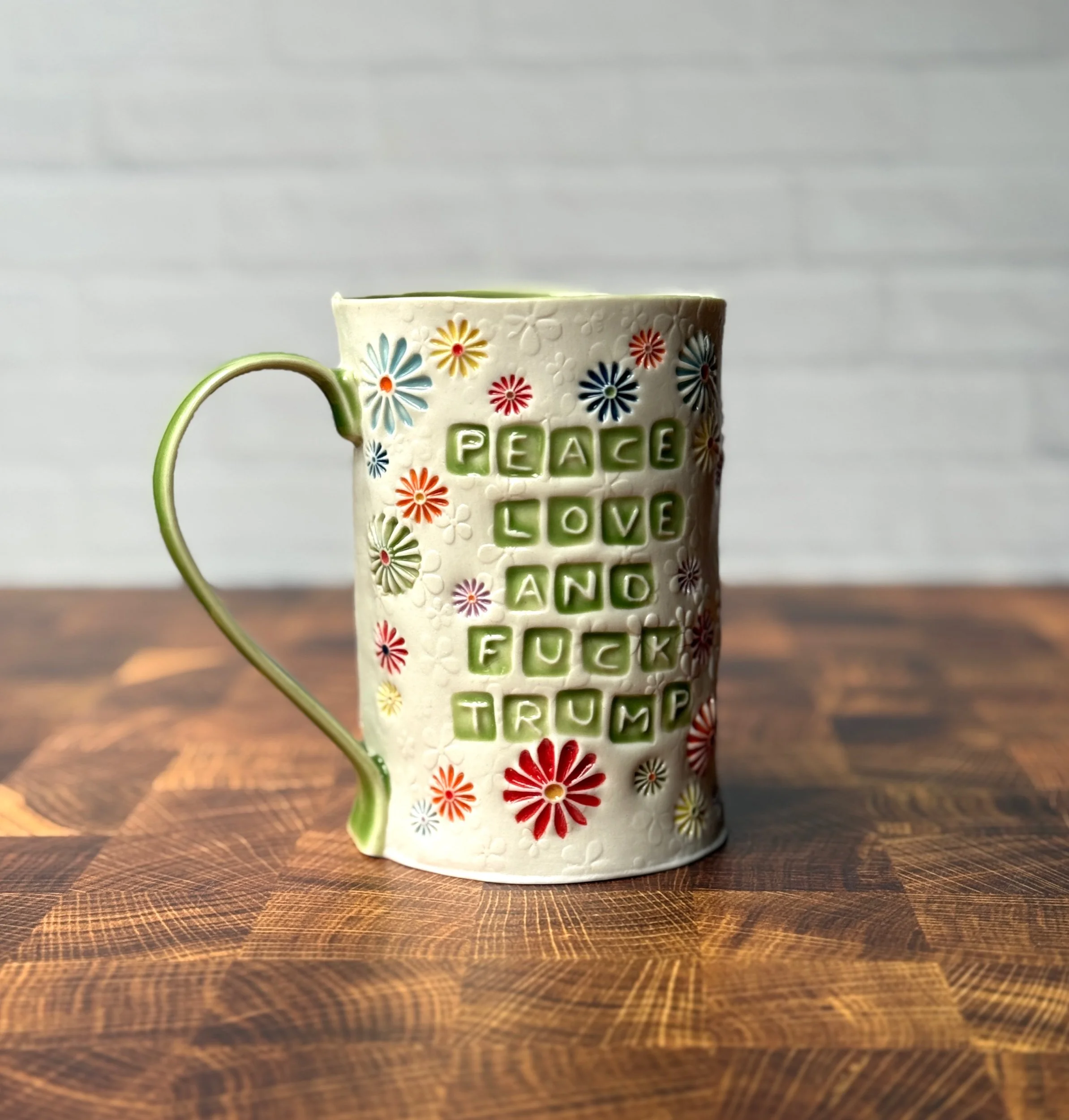 ****This listing is a PREORDER for the “Peace, Love, and Fuck Trump” Daisyware mug. Approximate fulfillment is 10-12 weeks****