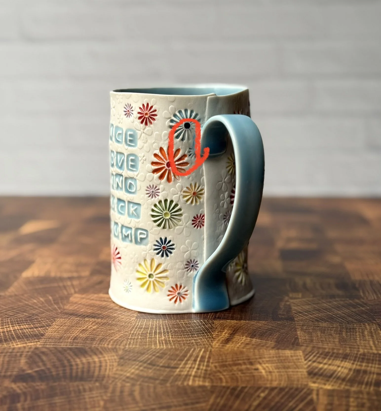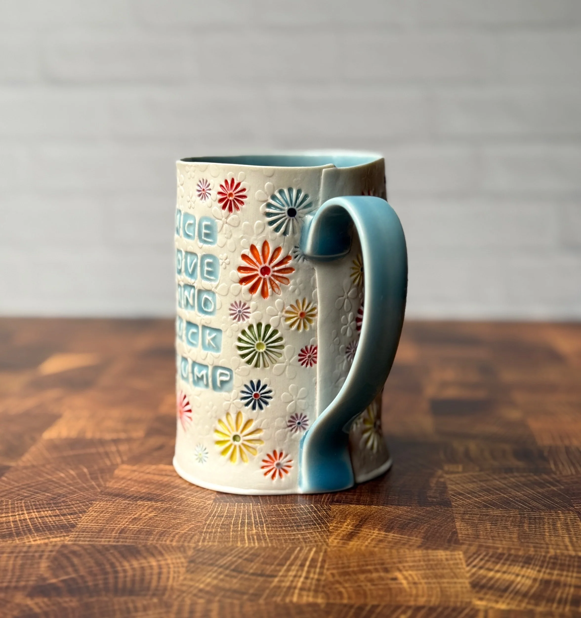 mug will be made to order, and you can choose what colors you want for the lettering, handle & interior! Any of the rainbow colors that are in the daisies will work. Please just let me know in the Notes section of your order. Also feel free to change up the wording—if your prefer “Peace, Love, & Fuck Fascism” just let me know!