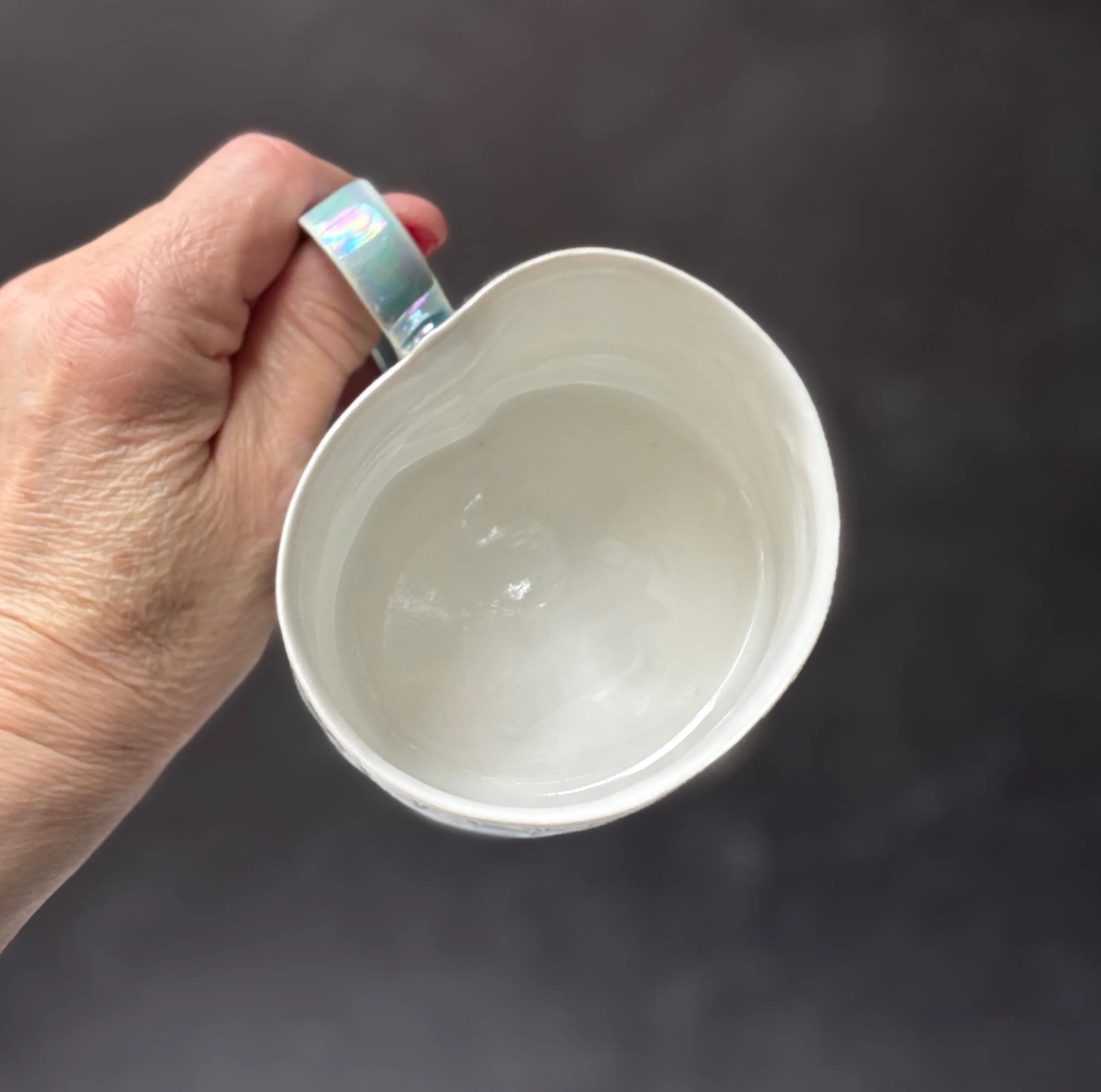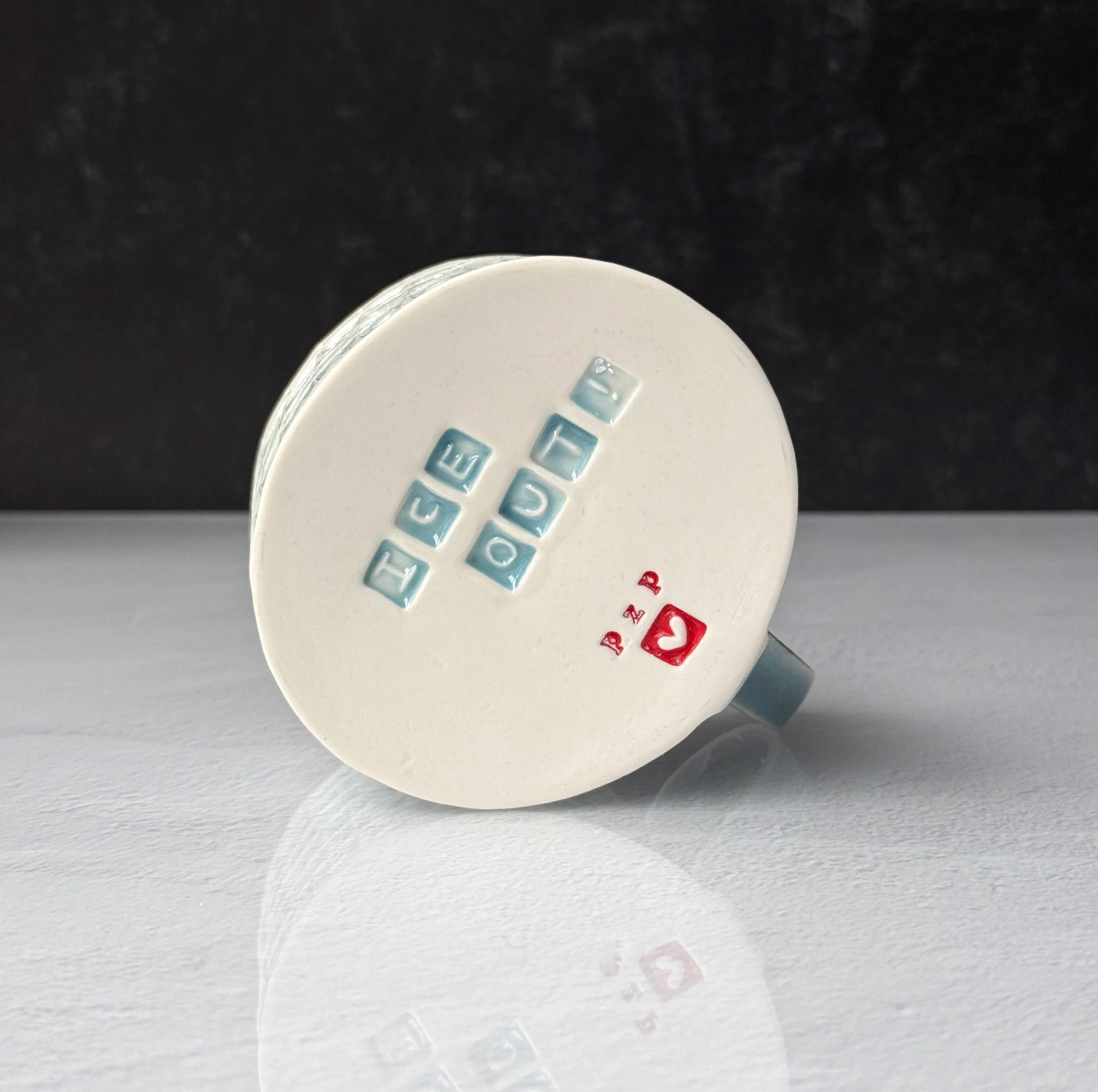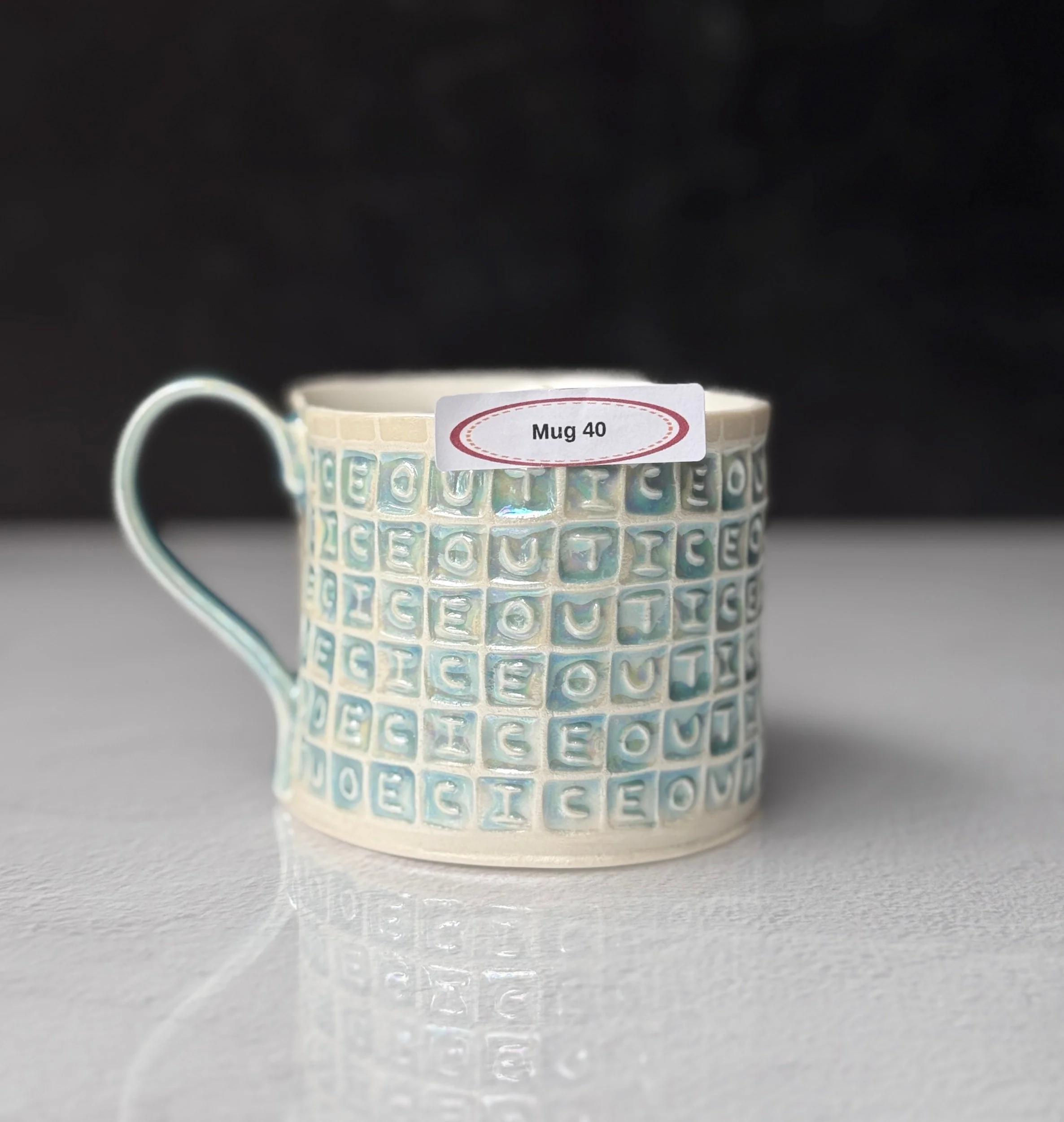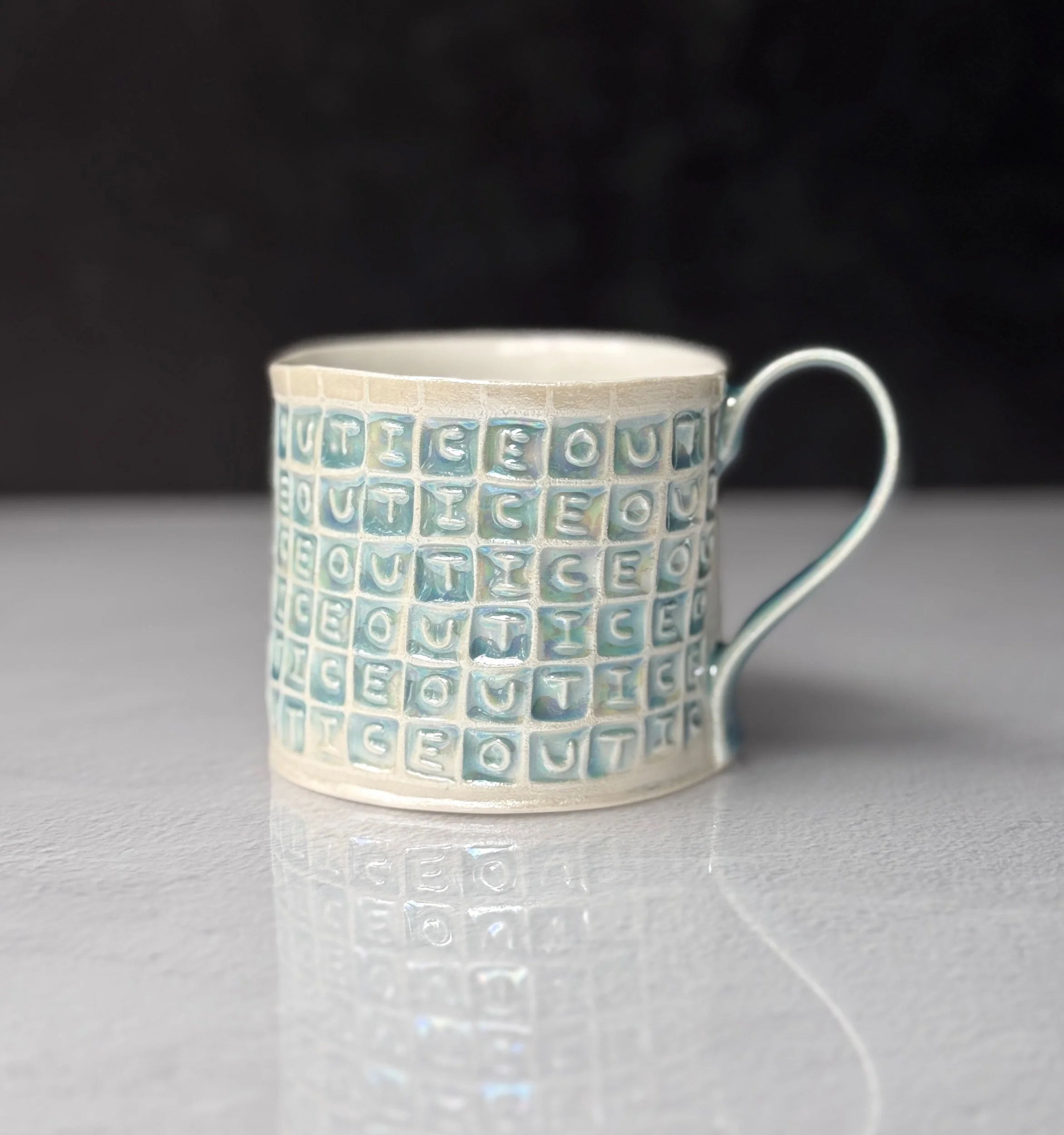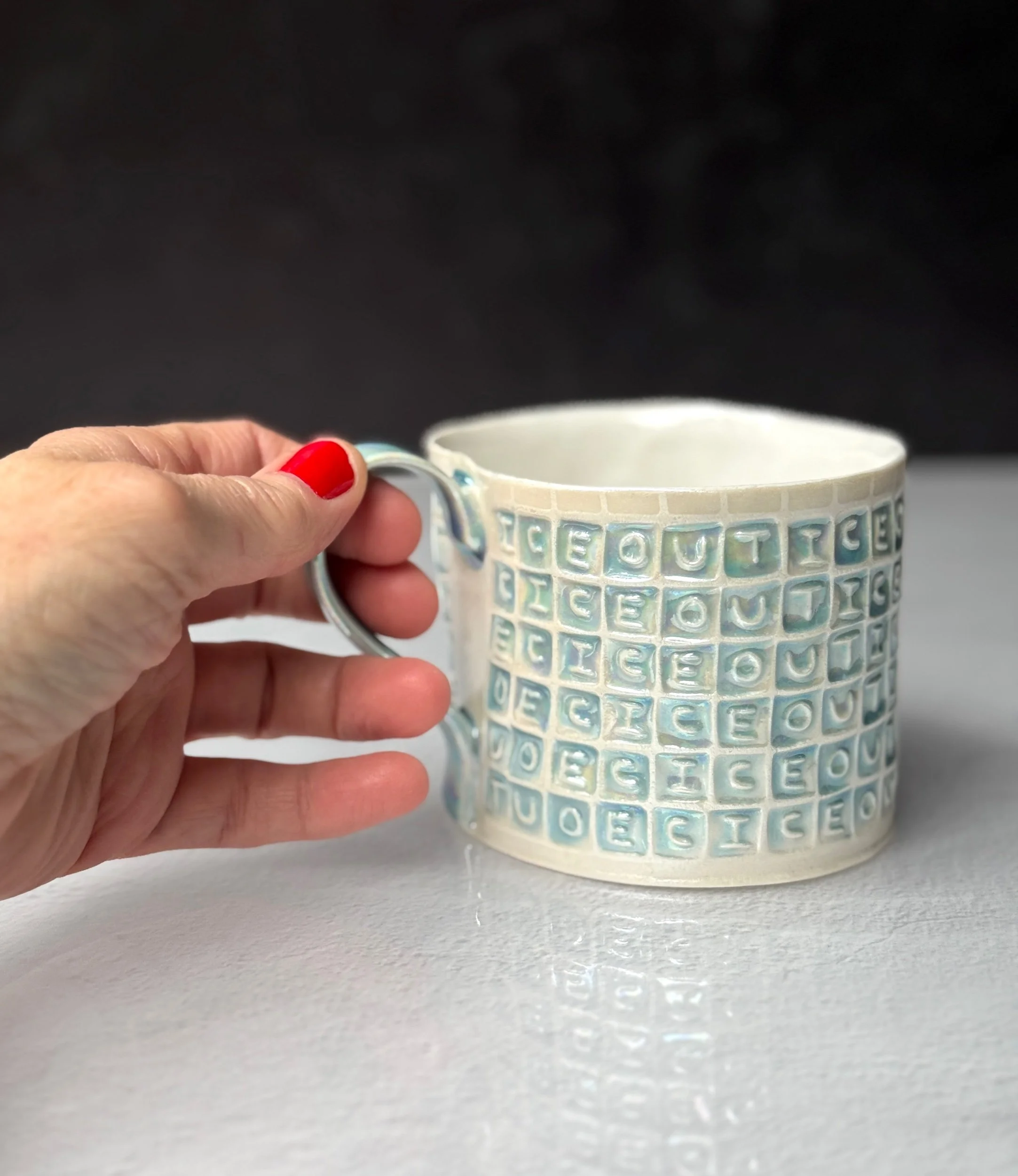 This mug has been hand built from translucent porcelain. The slab is first rolled out, printed with a newsprint transfer, and hand stamped, before being shaped into the mug form. After the first (bisque) firing, each square is filled with an icy blue celadon glaze, and then fired for a second time. To add that extra iridescent quality, the piece is then painted with mother-of-pearl luster, then fired for a third and final time.